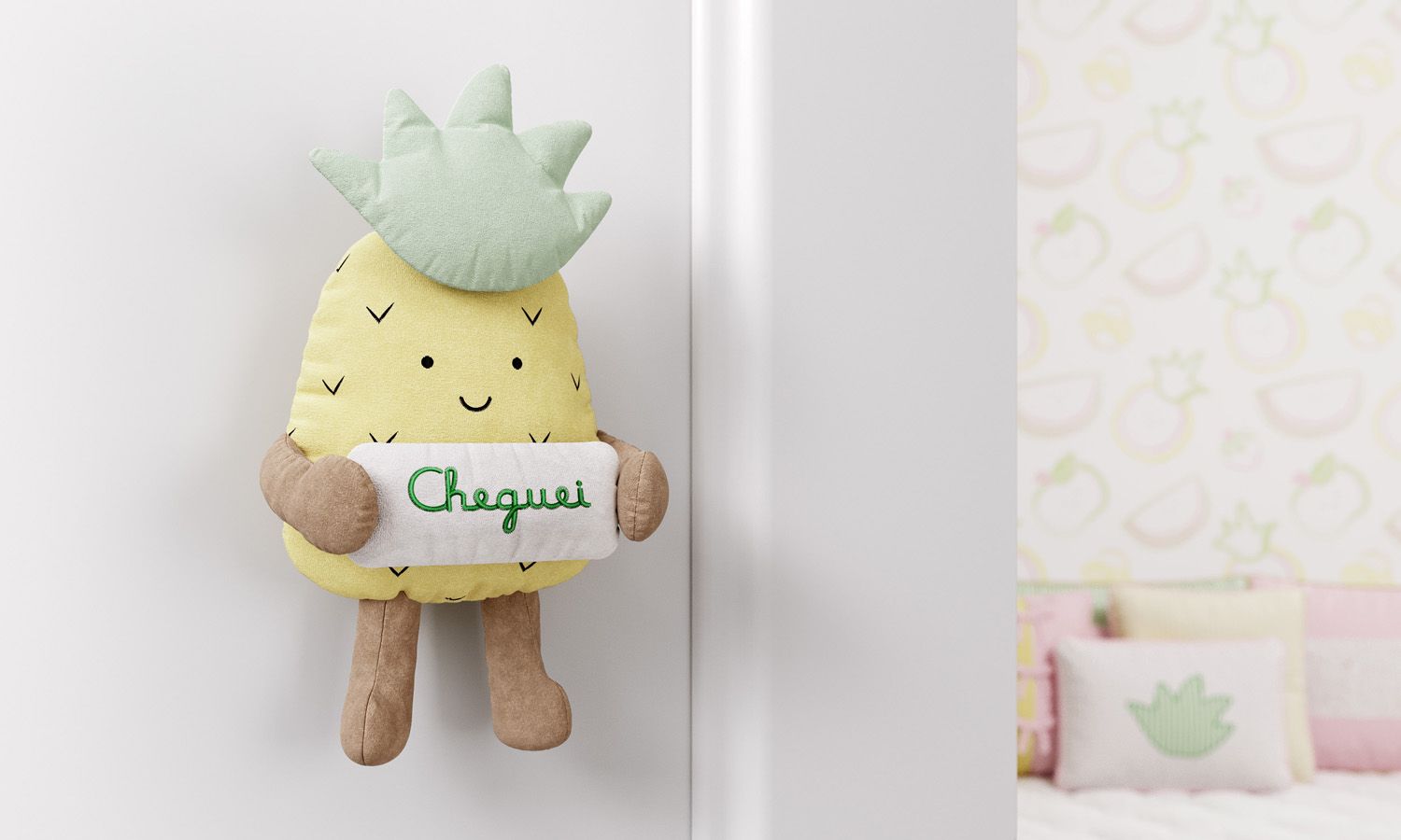 O Porta Maternidade Cheguei Amiguinho Abacaxi 23cm recepciona as visitas com o charme da Frutinha Abacaxi. A palavra cheguei bordada mostra a delicadeza e capricho do enfeite.