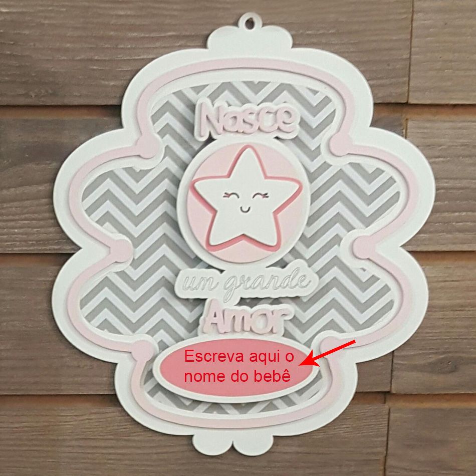 Esse produto que já é indispensável nas portas das maternidades e quartos de recém-nascidos, se destaca pelo espaço para escrever o nome do novo membro da família. Fazer isso é simples e as mamães vão adorar o resultado! Para escrever o nominho podem ser utilizados materiais como, por exemplo, EVA, MDF, Caneta, Cola Colorida, entre outras opções que vão de acordo com o gosto e criatividade das mamães e também dos papais.