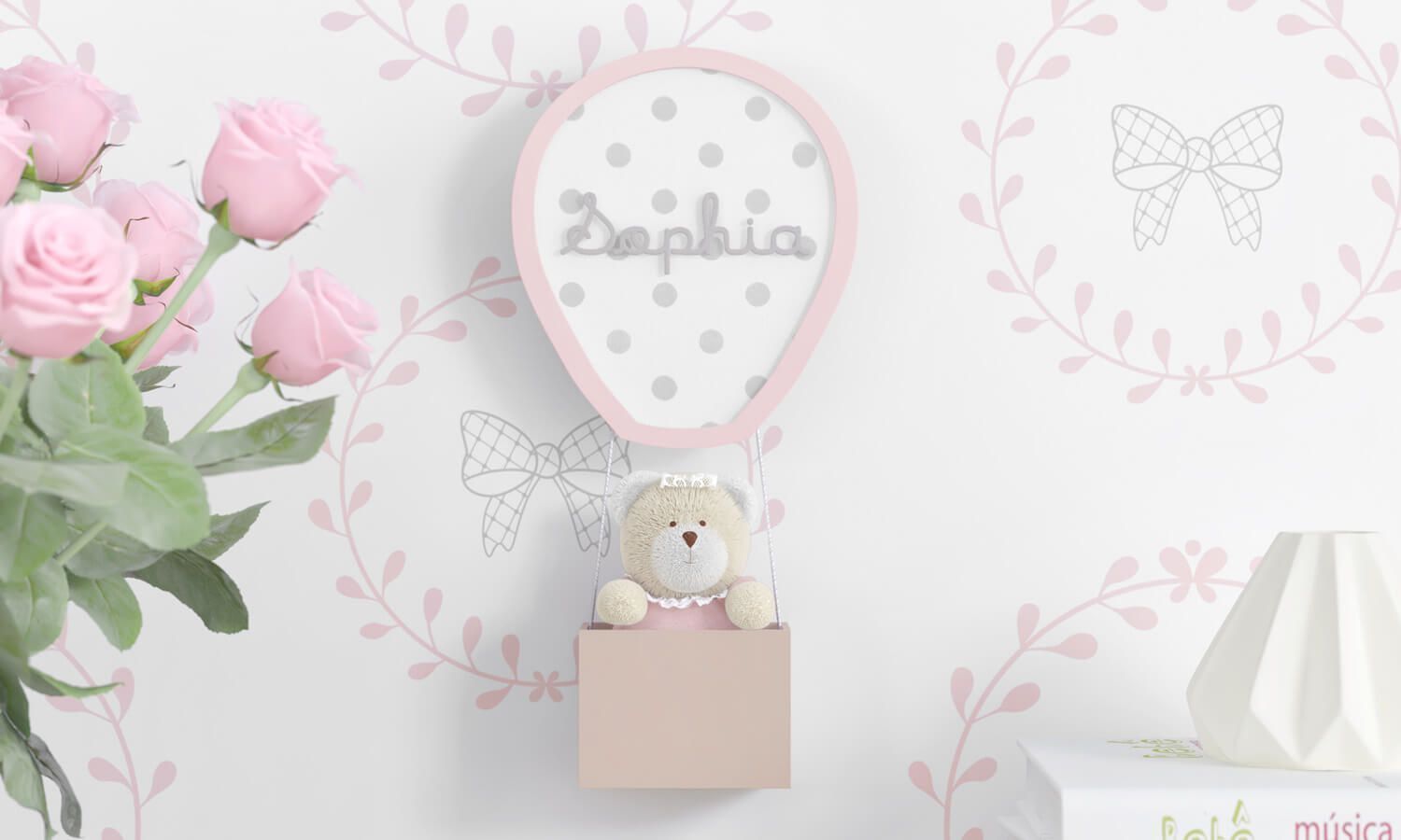 Uma ursinha de pelúcia charmosa viajando num balão com destino ao quarto de princesa dos sonhos! Essa é a melhor definição para o Porta Maternidade Ursinha no Balão Personalizado 30cm, que encanta as mamães, as pequenas princesinhas e até aos papais. Perfeito para integrar a decoração do quarto de bebê com harmonia e muita delicadeza. O destaque é que esse quadrinho é personalizável e o nome da sua pequena princesa pode fazer parte do visual desse enfeite apaixonante. Não deixe de conhecer os outros quadrinhos da linha Princesa Clássica e complemente essa decoração especial!