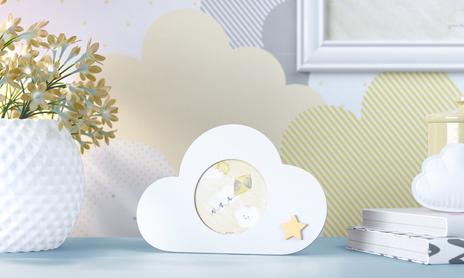 Em formato de nuvem, esse porta retrato para quarto de bebê traz um visual lúdico à decoração para colocar lindas fotos dos pequenos.