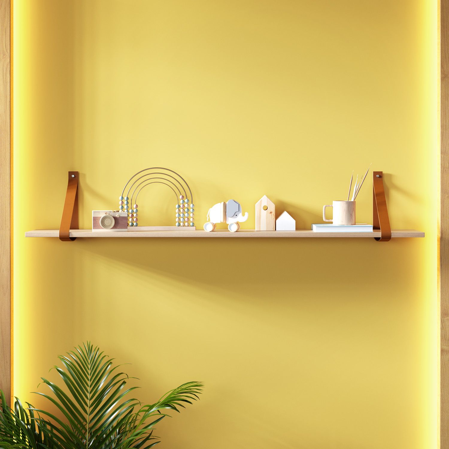 Espaço ideal para arrumar caixinhas organizadoras, livros e bichinhos de pelúcia, as alças em couro são o destaque desta prateleira cheia de originalidade.