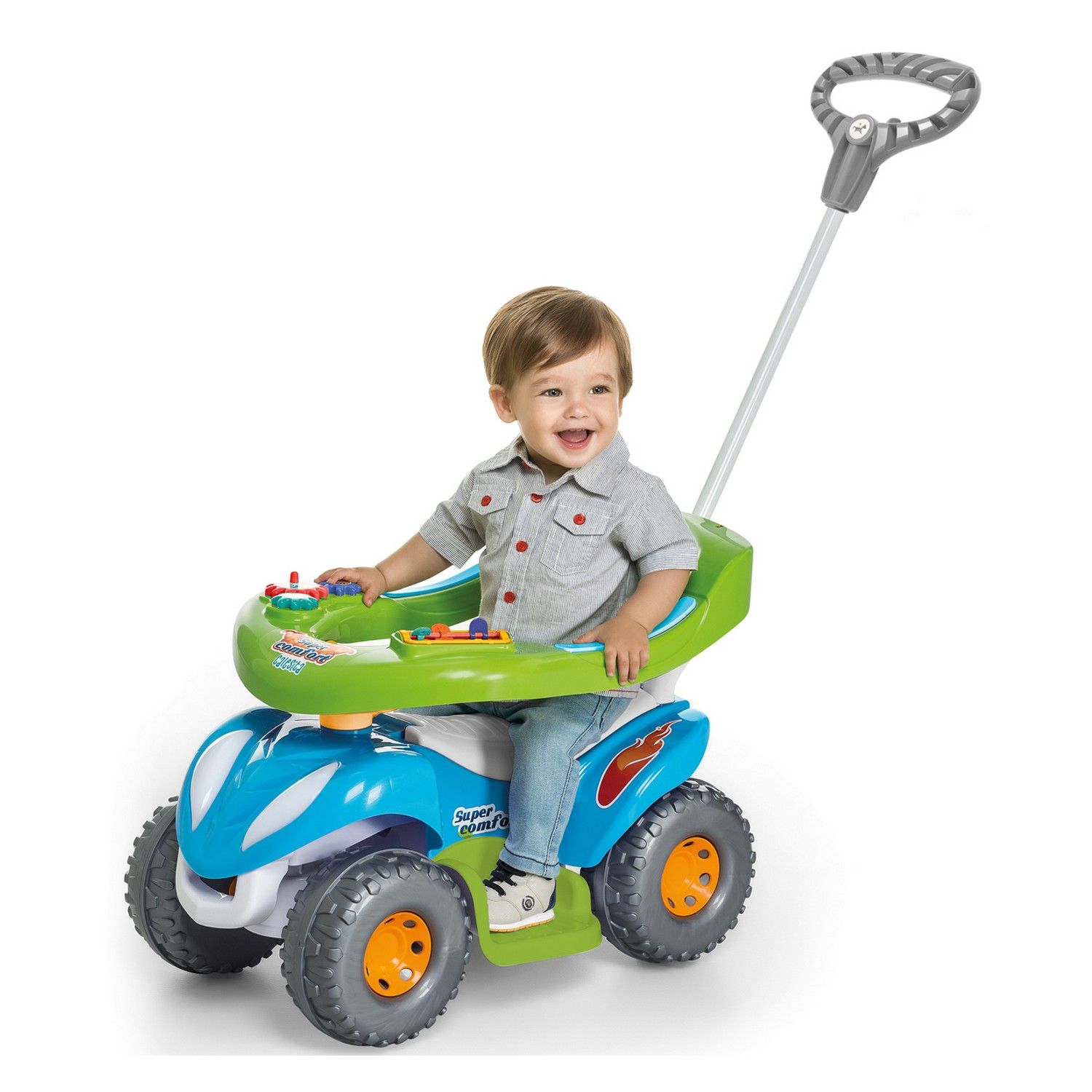 Os pequenos vão amar o Quadriciclo com Empurrador Super Confort Calesita , um acessório que tem tudo para se tornar um verdadeiro companheiro de aventuras!