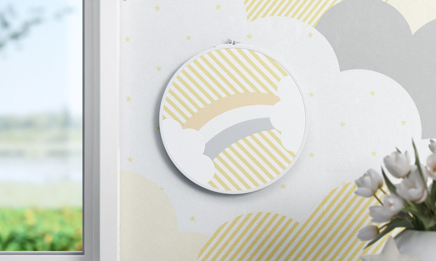 Confeccionado em madeira 100% MDF, o Quadro Bastidor Arco-Íris Listrado Amarelo/Branco 20cm encanta e dá um toque gracioso e delicado a decoração do quarto de bebê nuvem.