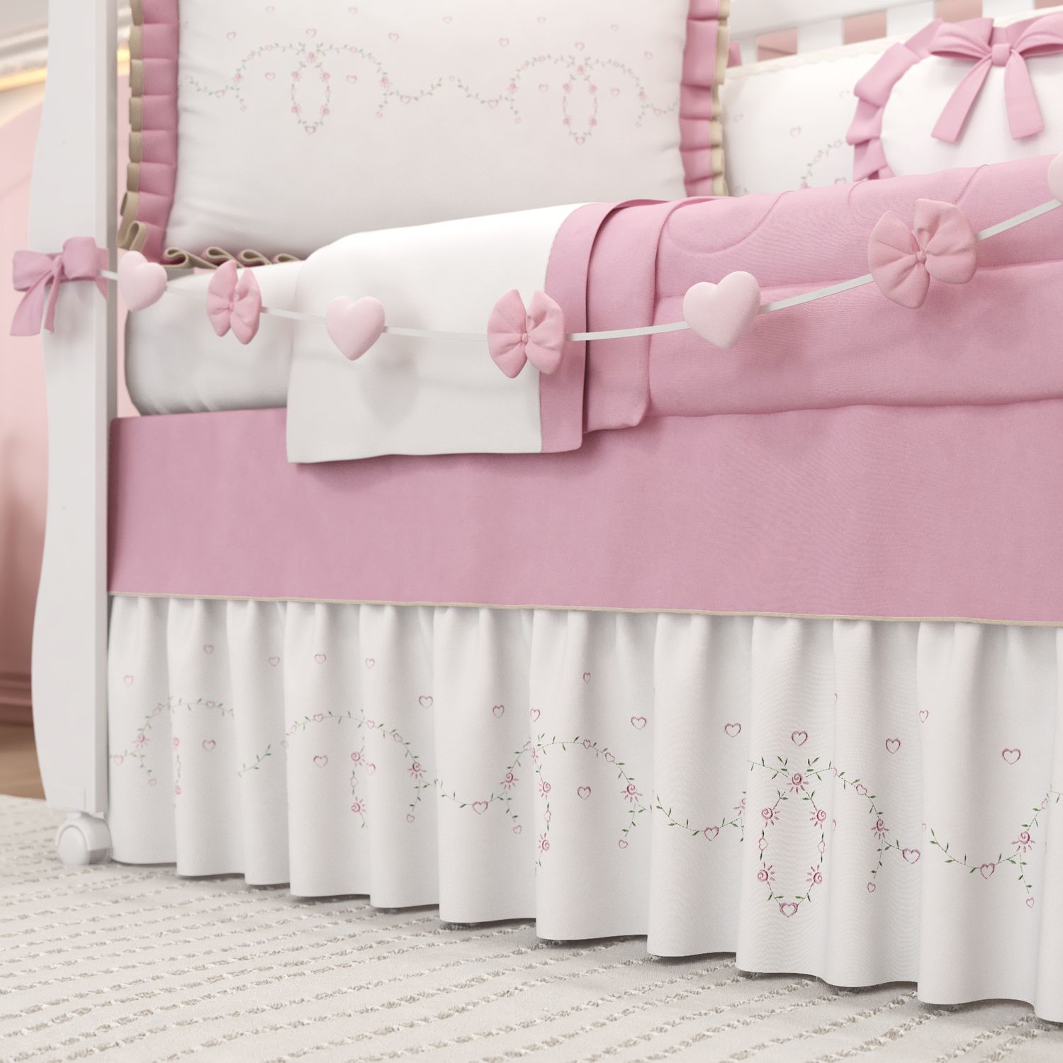 Saia de Berço Bordada Flores e Corações Alice