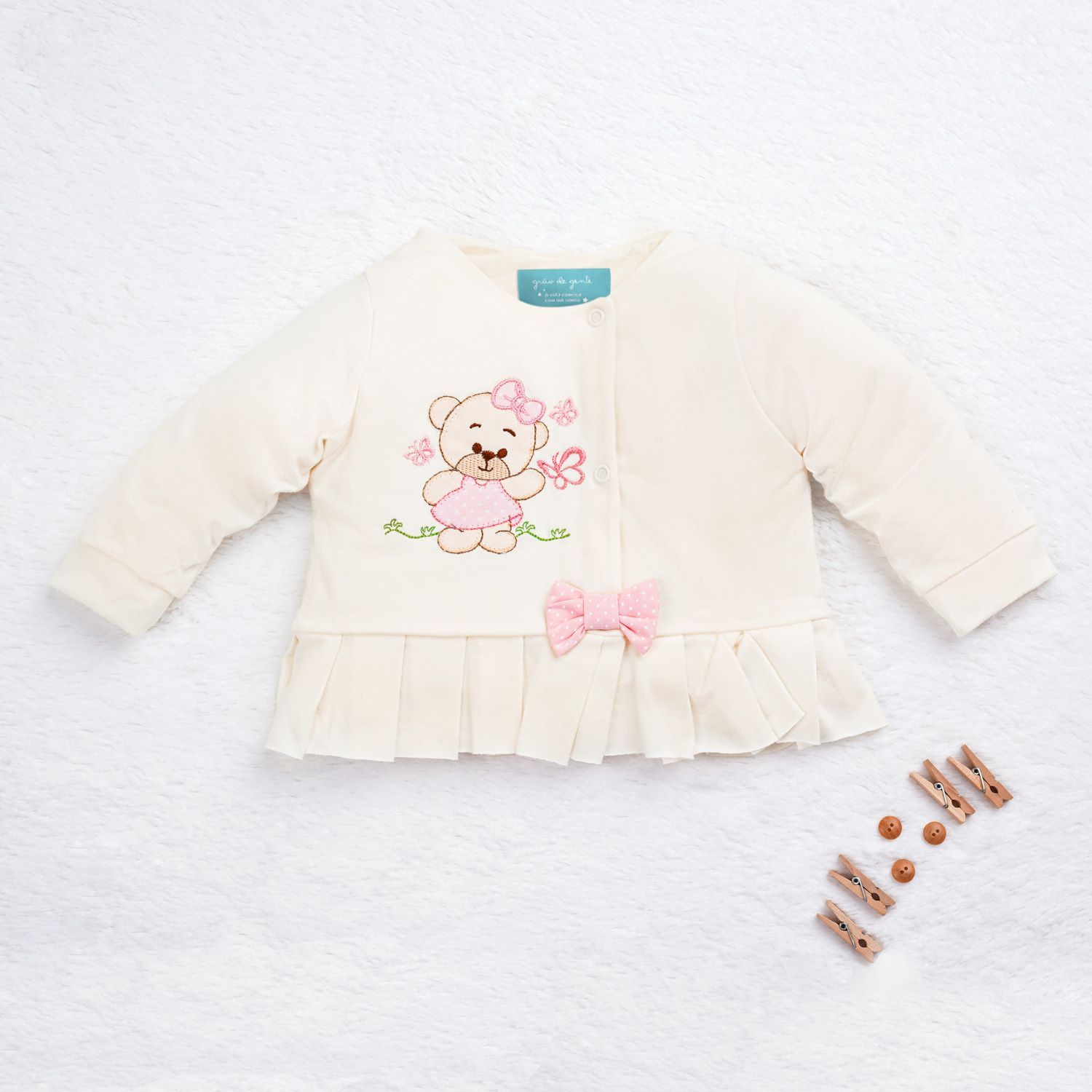 Conforto e meiguice em cada detalhe! A Saída Maternidade Ursinha Poá Rosa e Creme reúne charme e carinho para vestir sua menina nesse momento especial. São quatro peças confeccionadas com o toque macio de malha 100% algodão: um macacão com gola bebê poá, um casaquinho bordado com a barra plissada e uma faixinha de cabelo de renda finaliza o conjunto. Além da manta com viés cor-de-rosa e bordado para combinar com vários looks!