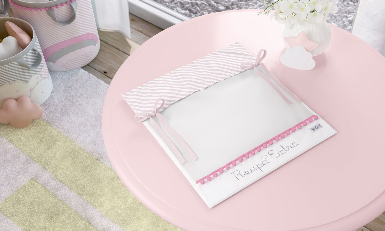 O Saquinho Maternidade para Roupinhas Listrado Rosa Primeiro Dia guarda as roupas de bebê com muito cuidado. Confeccionado com tecido 100% algodão, estampa listradinha rosa e branca, lacinhos e mini pompons, o acessório conta com a frase bordada para identificar as peças que serão usadas logo no início.