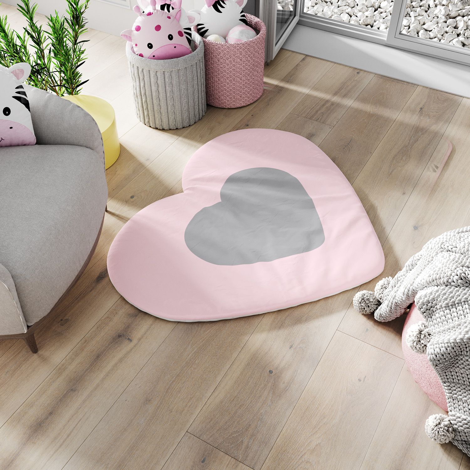 Exclusividade da Grão de Gente, o Tapete Coração Rosa e Cinza é uma peça que vai levar um toque lúdico e romântico para a decoração do quarto de bebê ou infantil. Esse tapetinho é produzido com verso antiderrapante, para evitar que deslize no piso.