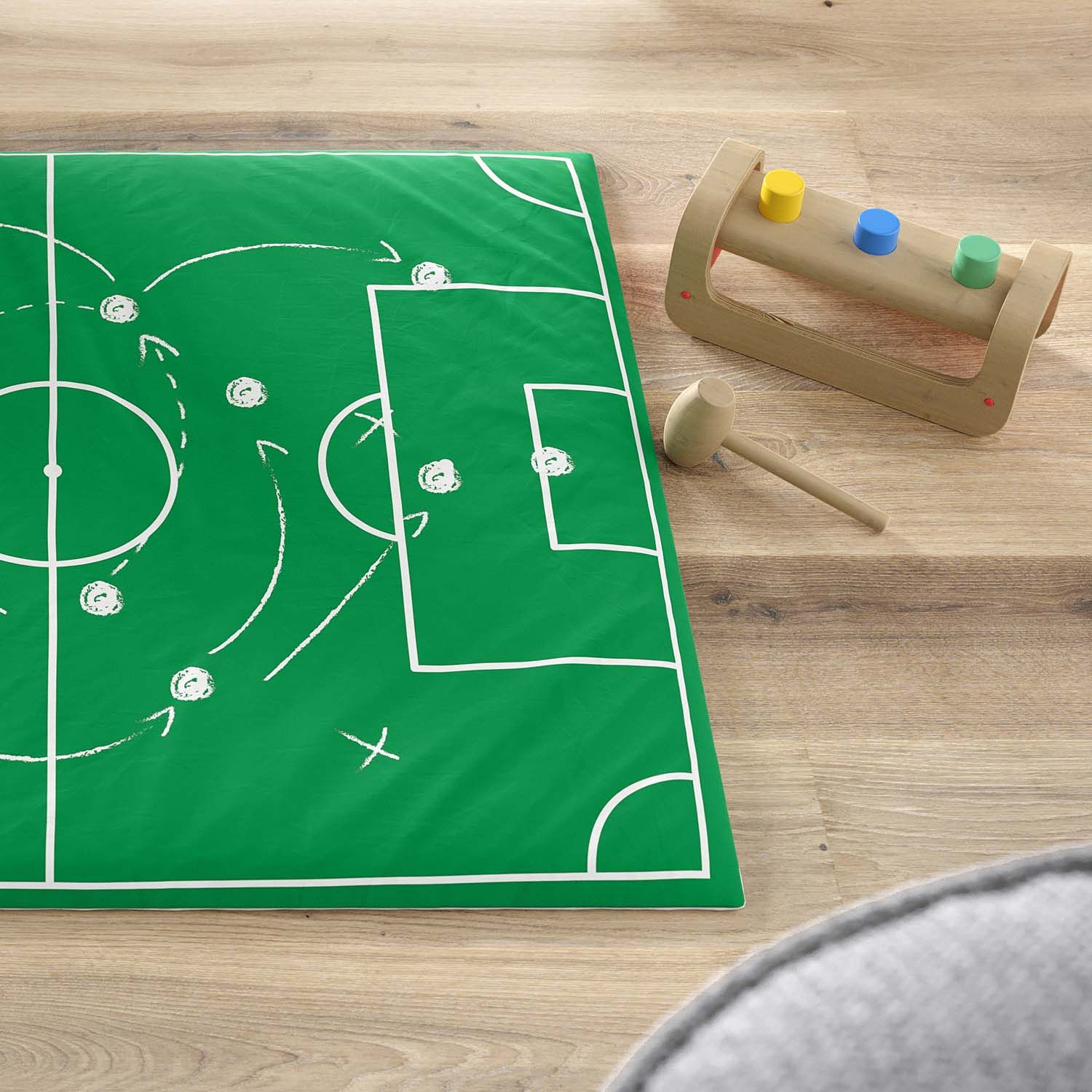 Versátil e encantador, o acessório capricha na criatividade e instiga a imaginação dos pequenos jogadores com uma estampa lúdica que simboliza o esquema tático de uma Seleção de Futebol.
