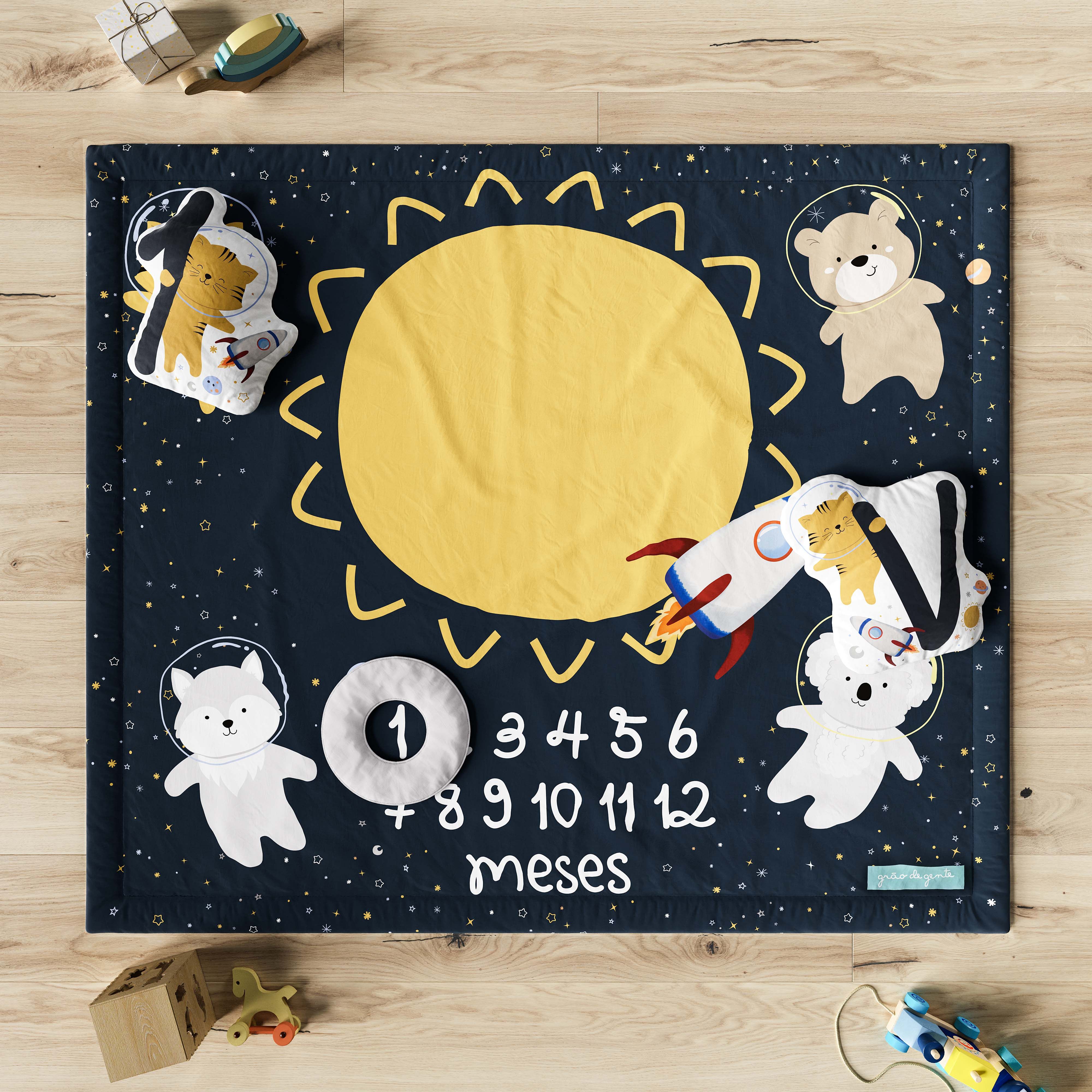 O Tapete Mêsversário Amiguinhos Astronauta é uma criação exclusiva da Grão de Gente para capturar e guardar para sempre cada momento especial do desenvolvimento do seu bebê.