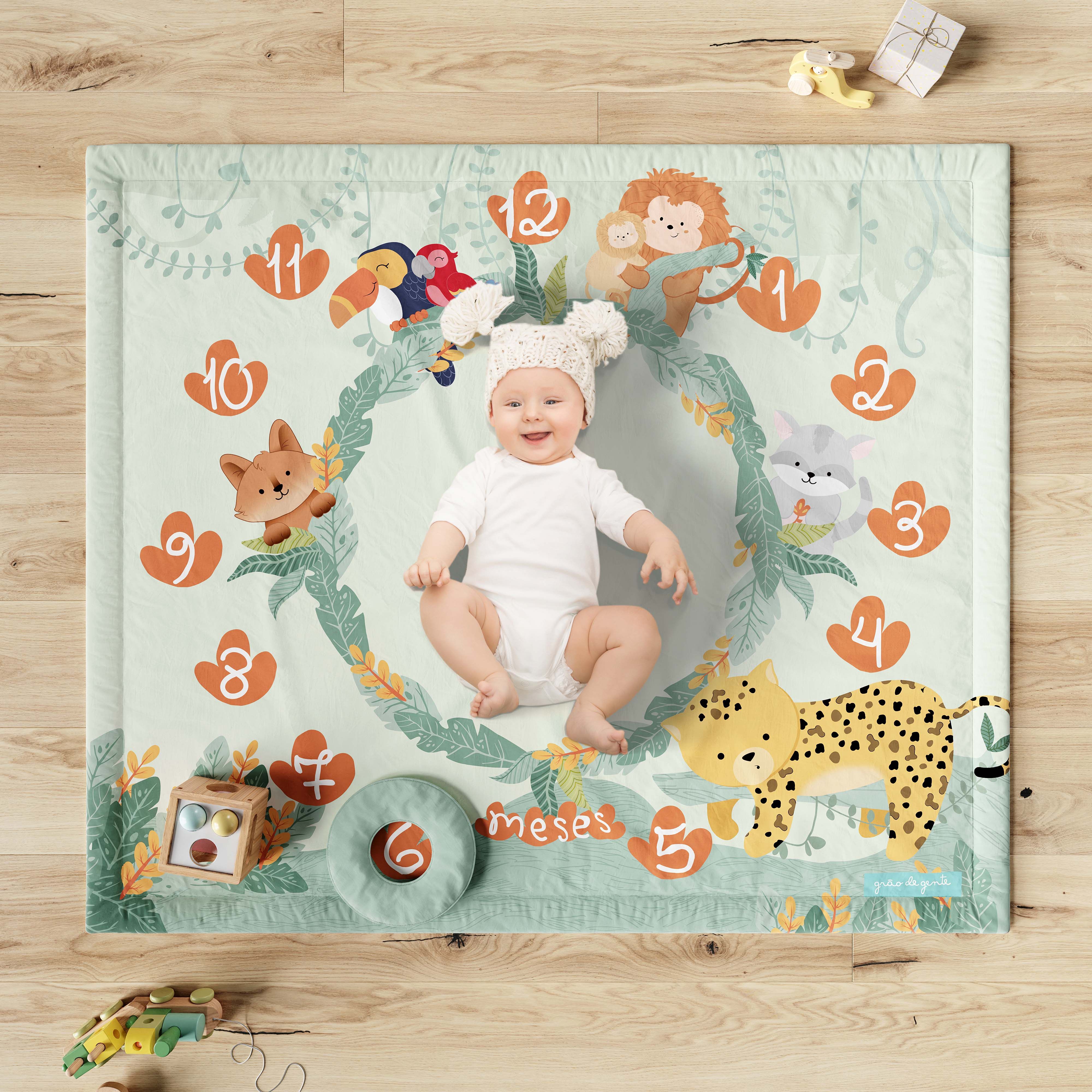 O Tapete Mêsversário Amiguinhos da Fauna Brasileira é uma criação exclusiva da Grão de Gente para capturar e guardar para sempre cada momento especial do desenvolvimento do seu bebê.