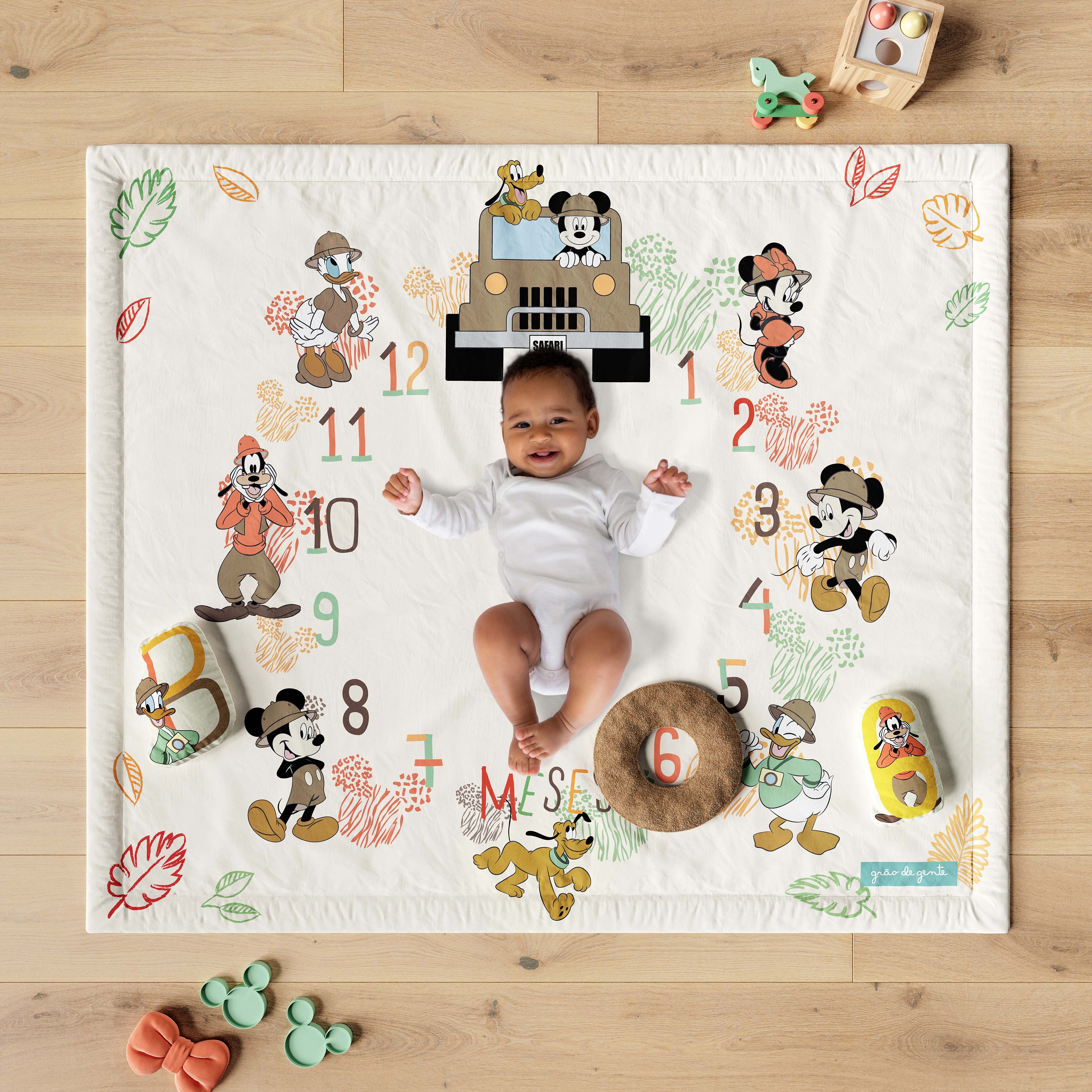 O Tapete Mesversário Mickey Mouse Safári é uma criação exclusiva da Grão de Gente para capturar e guardar para sempre cada momento especial do desenvolvimento do seu bebê.