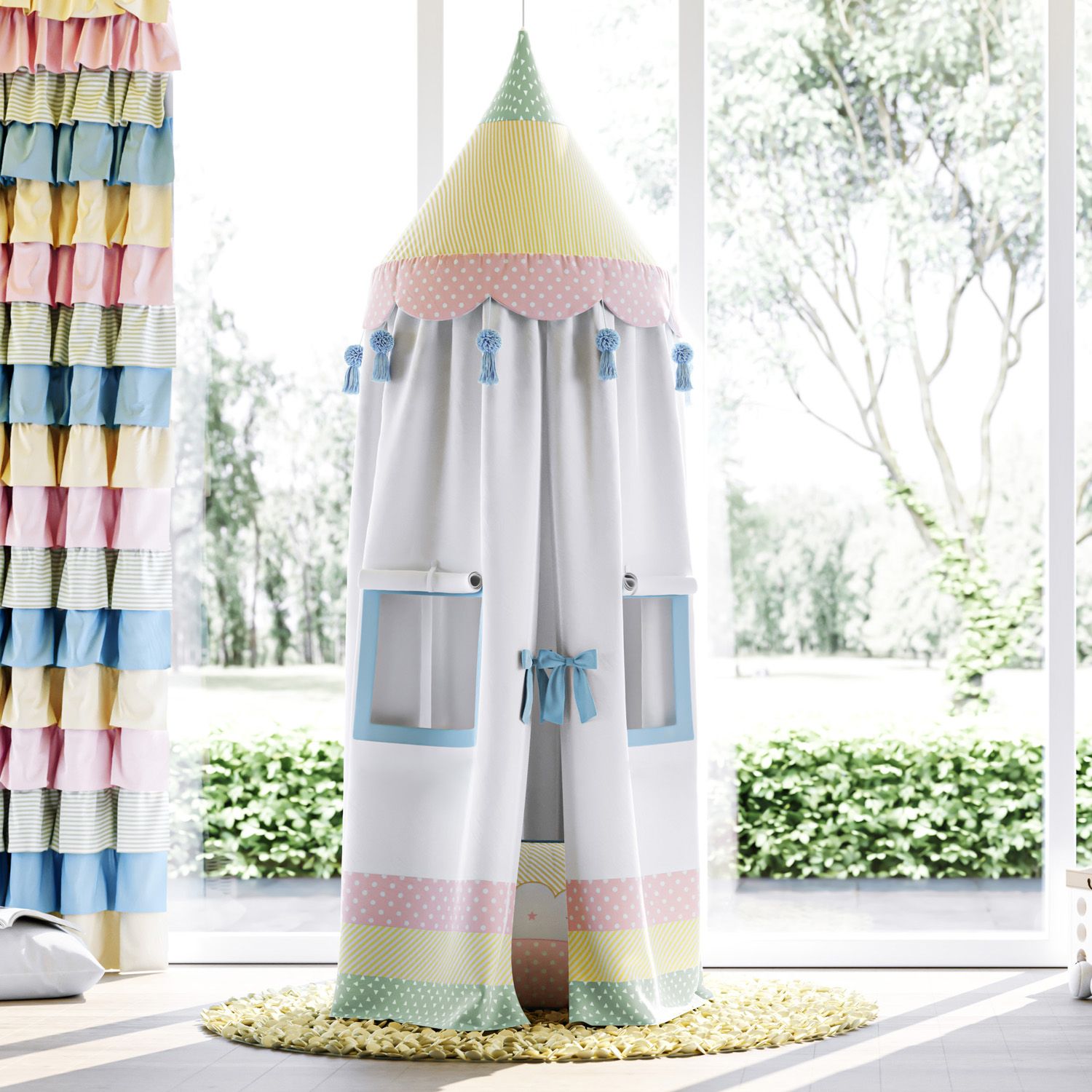 Criamos uma atmosfera multicolorida e repleta de amor para mostrar que além do horizonte, a Tenda Dossel Arco-Íris é a representação da diversão no quarto infantil! Com detalhes em pompons, tassel e um mix de estampas geométricas, a composição é perfeita para completar a decoração do ambiente de forma totalmente lúdica! Charmosas janelinhas nas laterais permitem que a pequena se divirta de montão com esse acessório colorido.