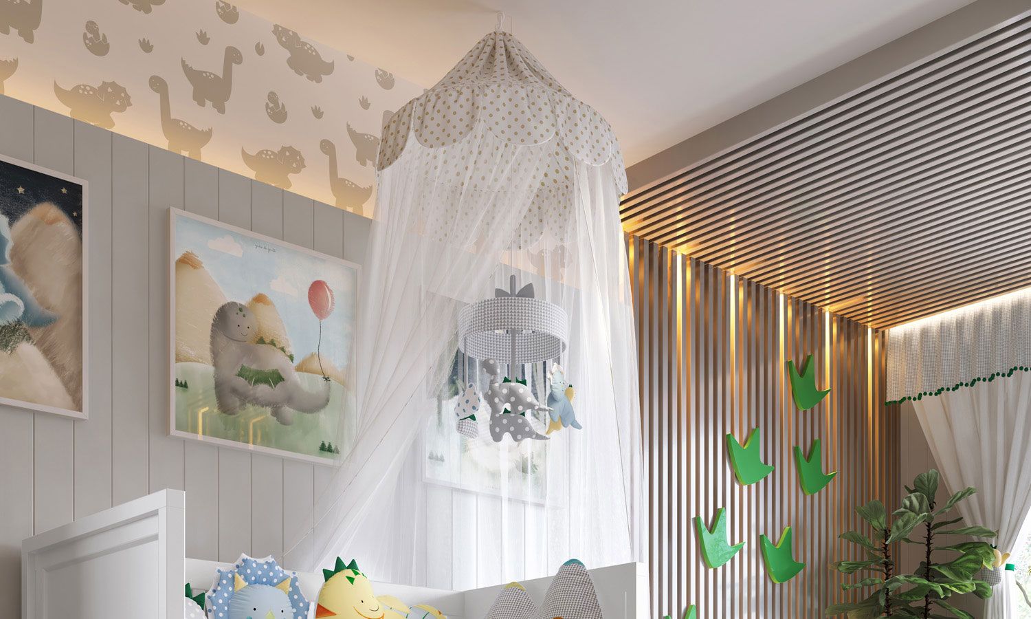 A Tenda Dossel Poá Bege 2m cria um cantinho super aconchegante no quarto de bebê dinossauro! Ela é confeccionada com tule e suporte de plástico.