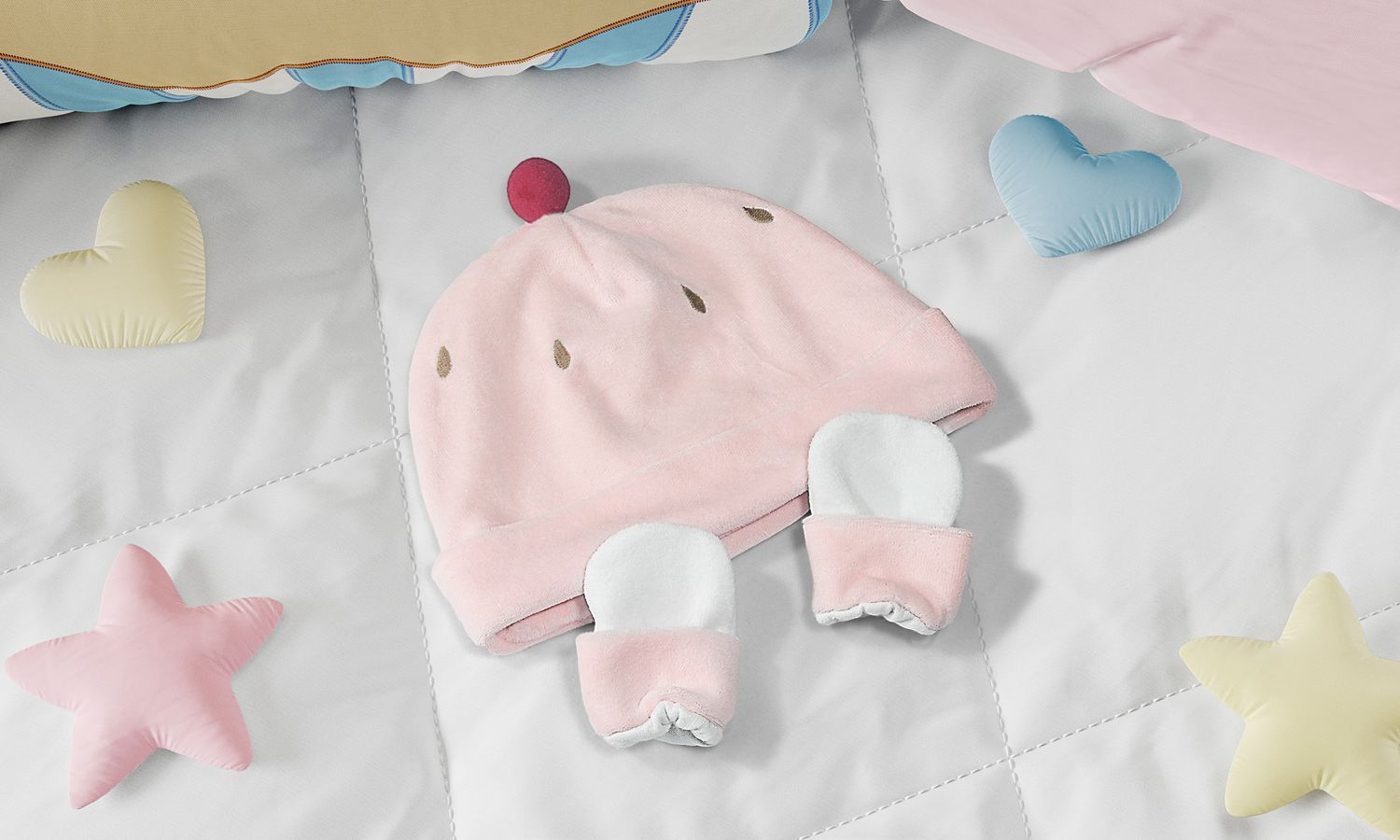 Sua menina vai ficar linda e aquecida com o conjuntinho de Touca e Luvas para Bebê Cupcake Cerejinha! Confeccionado em tecido plush macio, o gorro da Coleção Doce Encanto traz bordados de gotinhas de chocolate e pompom vermelho. As luvinhas brancas a com vira cor de rosa combinam com a touquinha e são ótimas para evitar que o recém-nascido se arranhe nos primeiros meses.