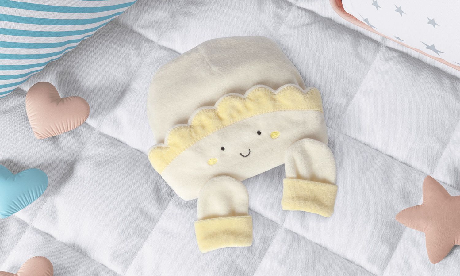 A touca para bebê tem o formato de um solzinho, já o par de luvas é amarelo clarinho com vira em tom mais escuro da cor.
