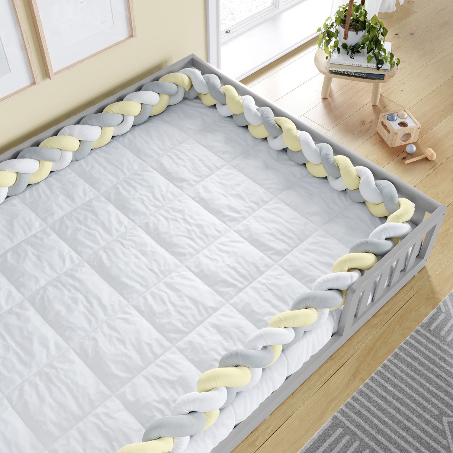 A Trança Lateral Para Cama Montessoriana Casal Branco Cinza e Amarelo é uma criação exclusiva da Grão de Gente para complementar a decoração do quarto montessoriano com a atmosfera moderna do protetor trançado.