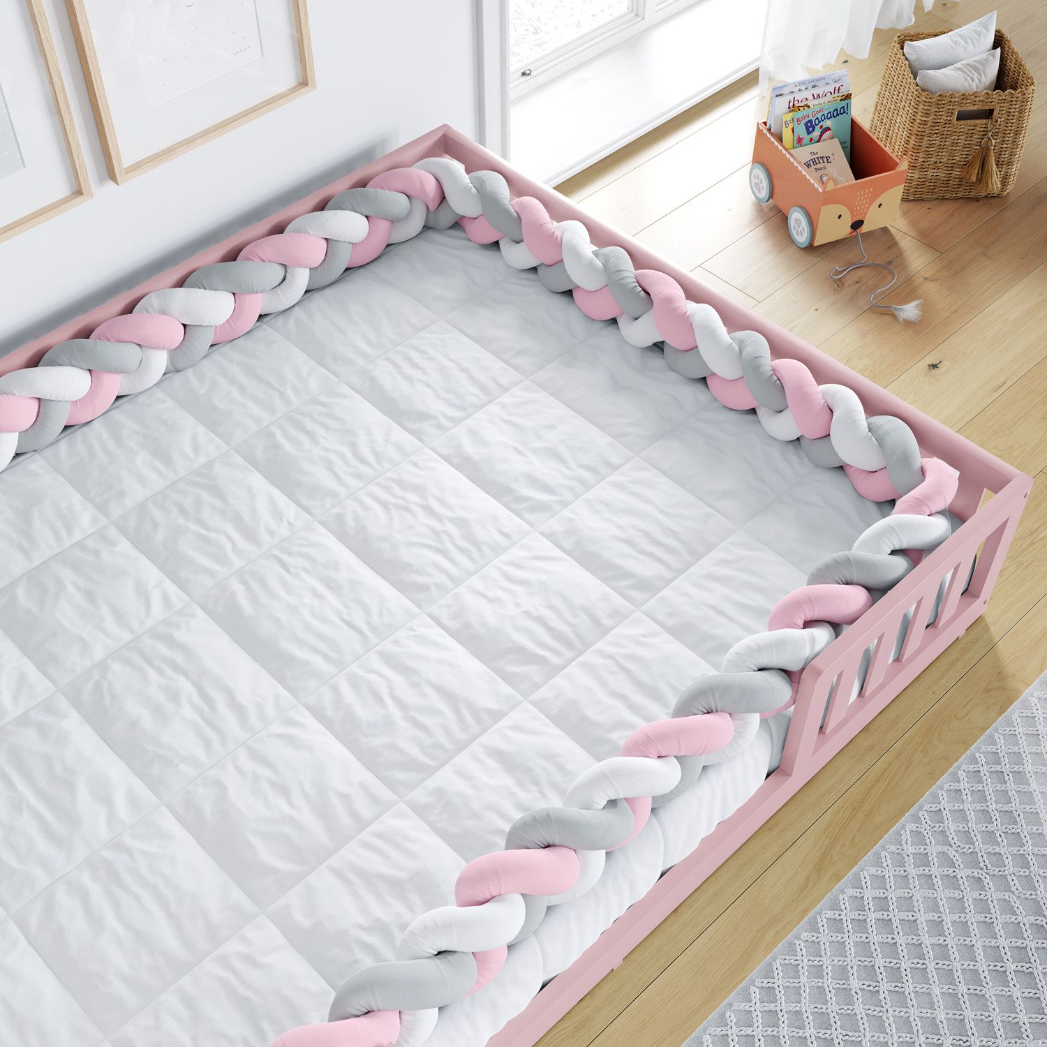 A Trança Lateral Para Cama Montessoriana Casal Branco Cinza e Rosa é uma criação exclusiva da Grão de Gente para complementar a decoração do quarto montessoriano com a atmosfera moderna do protetor trançado.