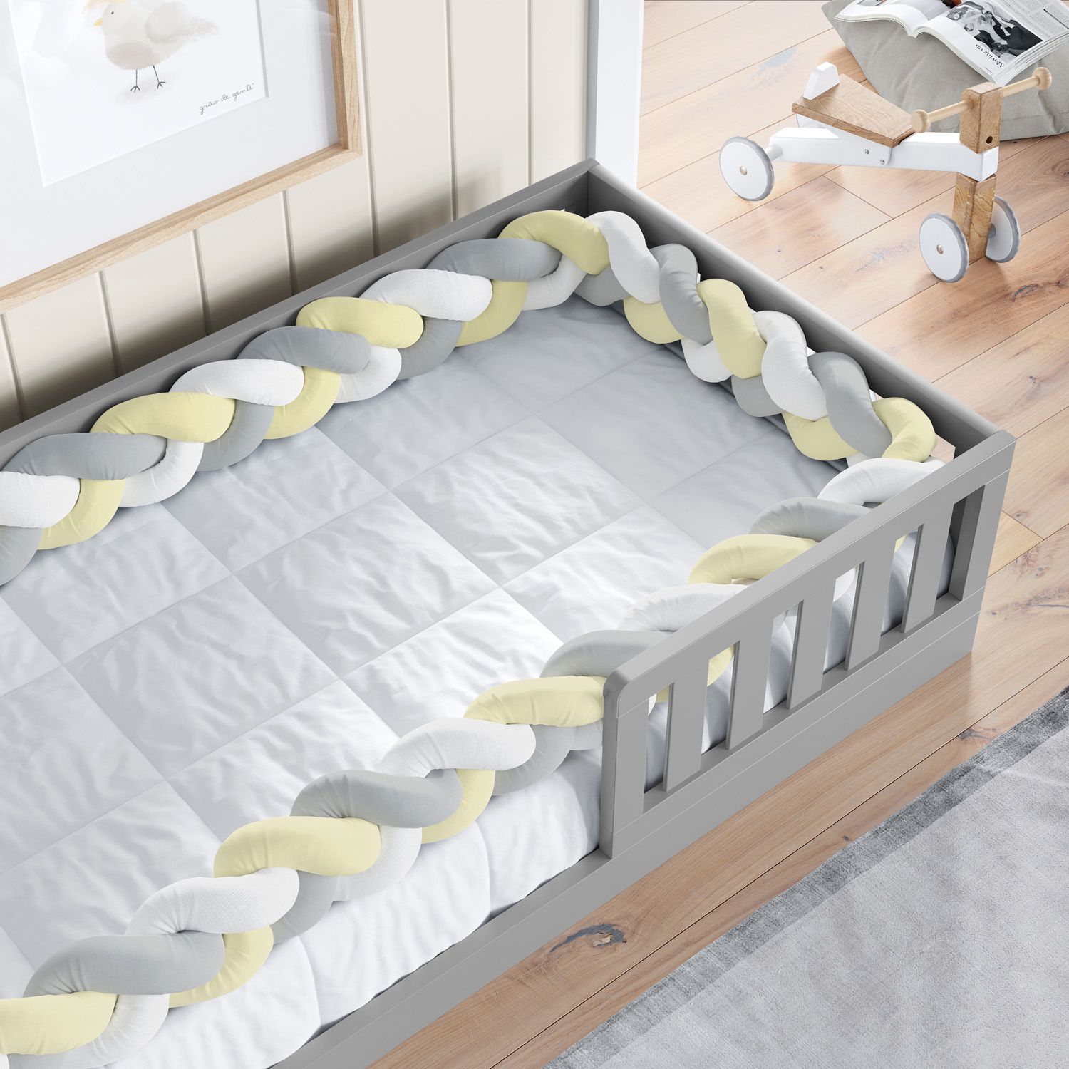A Trança Lateral Para Cama Montessoriana Solteiro Branco, Cinza e Amarelo é uma criação exclusiva da Grão de Gente para complementar a decoração do quarto montessoriano com a atmosfera moderna do protetor trançado.