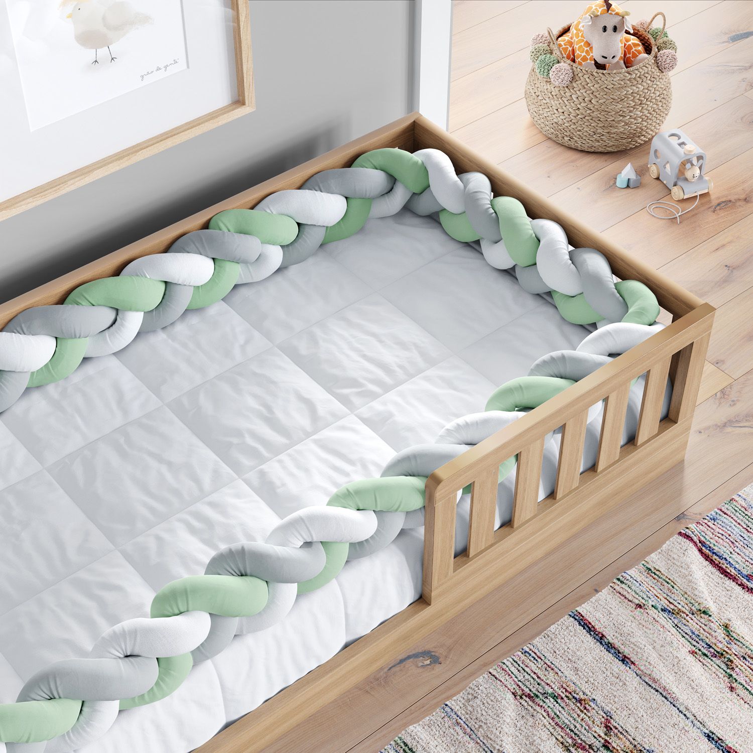 A Trança Lateral Para Cama Montessoriana Solteiro Branco Cinza e Verde é uma criação exclusiva da Grão de Gente para complementar a decoração do quarto montessoriano com a atmosfera moderna do protetor trançado.