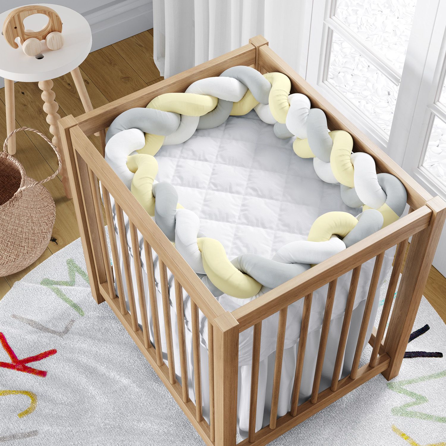 A Trança Lateral para Mini Berço Branco Amarelo e Cinza é uma criação exclusiva da Grão de Gente para complementar a decoração do quarto de bebê com a atmosfera moderna do protetor trançado.