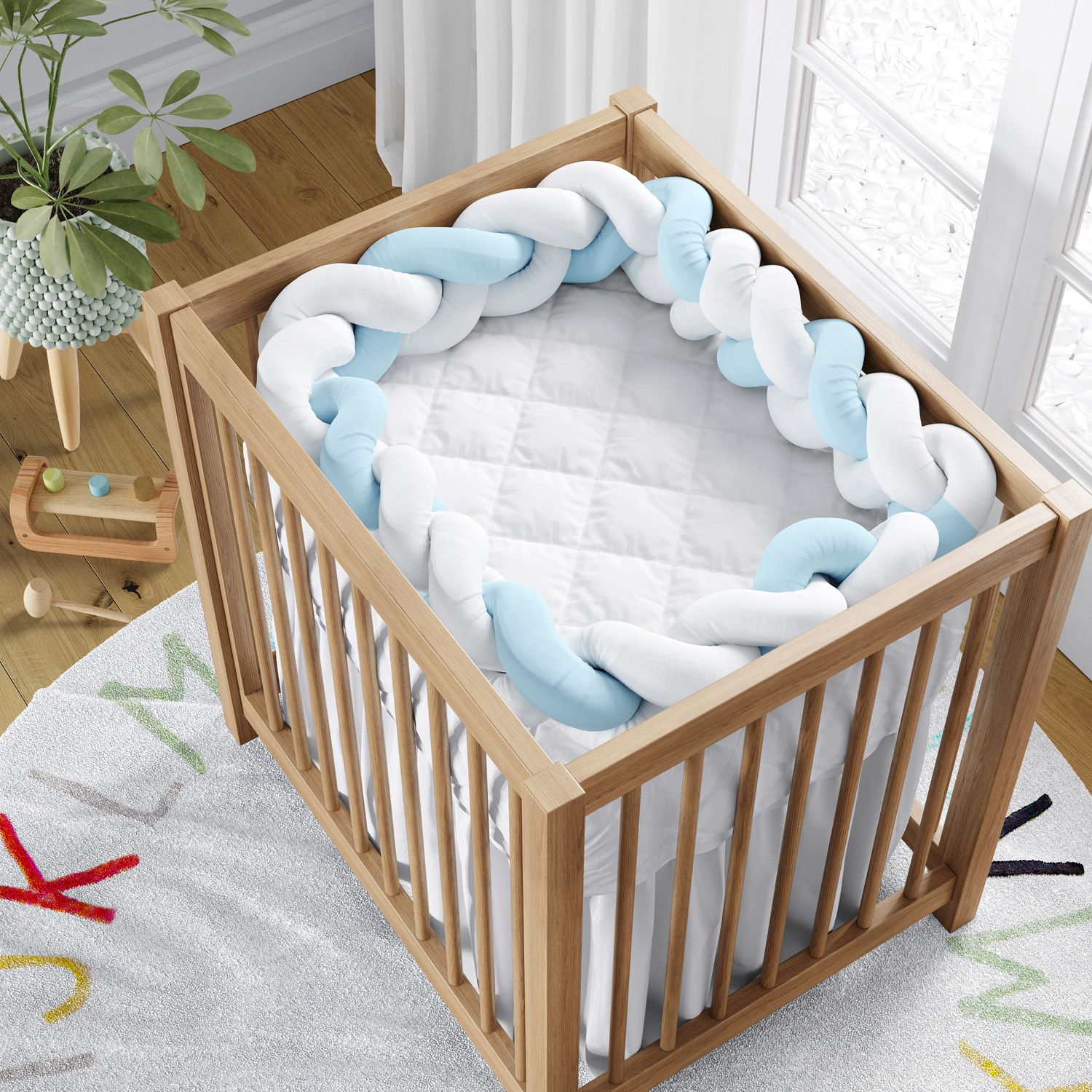 A Trança Lateral para Mini Berço Branco e Azul é uma criação exclusiva da Grão de Gente para complementar a decoração do quarto de bebê com a atmosfera moderna do protetor trançado.