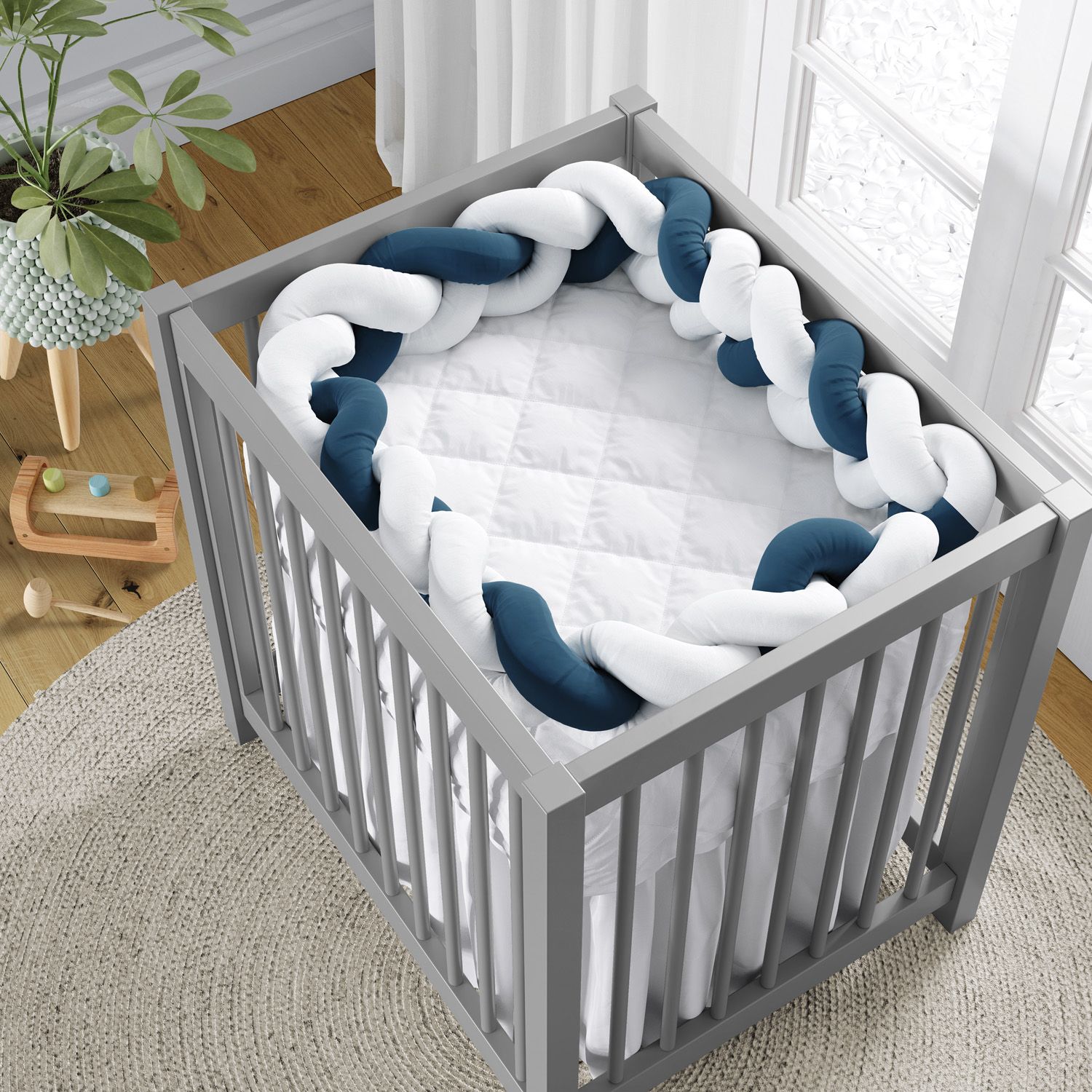A Trança Lateral para Mini Berço Branco e Azul Marinho é uma criação exclusiva da Grão de Gente para complementar a decoração do quarto de bebê com a atmosfera moderna do protetor trançado.