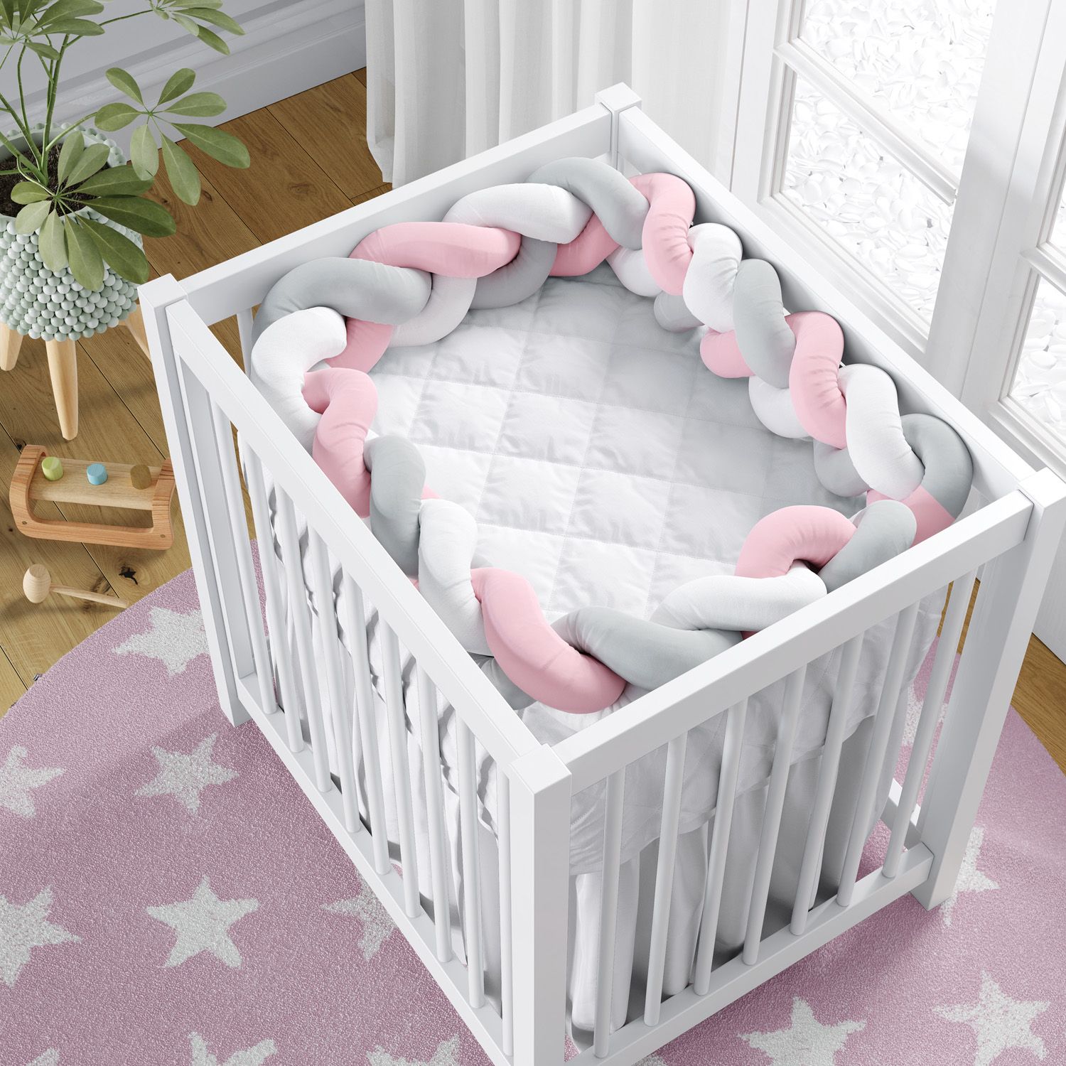 A Trança Lateral para Mini Berço Branco Rosa e Cinza é uma criação exclusiva da Grão de Gente para complementar a decoração do quarto de bebê com a atmosfera moderna do protetor trançado.