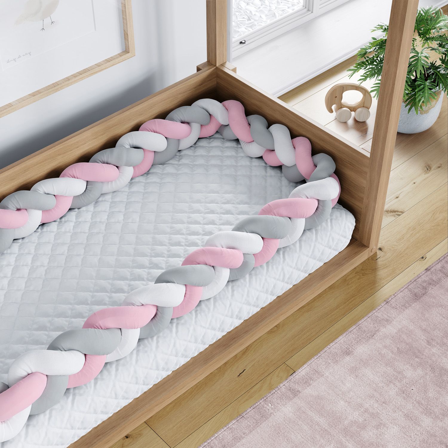A Trança Lateral Para Mini Cama Branco Cinza e Rosa é uma criação exclusiva da Grão de Gente para complementar a decoração do quarto infantil com a atmosfera moderna do protetor trançado.