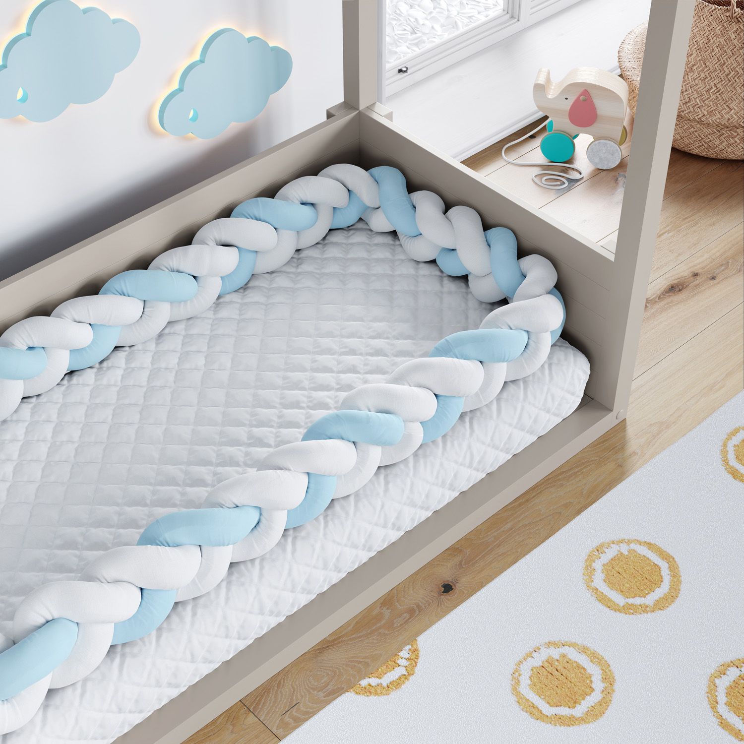 A Trança Lateral Para Mini Cama Branco e Azul é uma criação exclusiva da Grão de Gente para complementar a decoração do quarto infantil com a atmosfera moderna do protetor trançado.