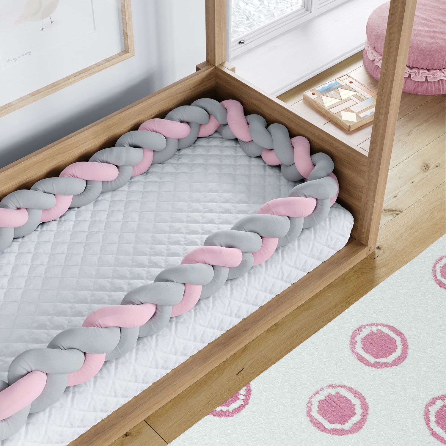 A Trança Lateral Para Mini Cama Cinza e Rosa é uma criação exclusiva da Grão de Gente para complementar a decoração do quarto infantil com a atmosfera moderna do protetor trançado.