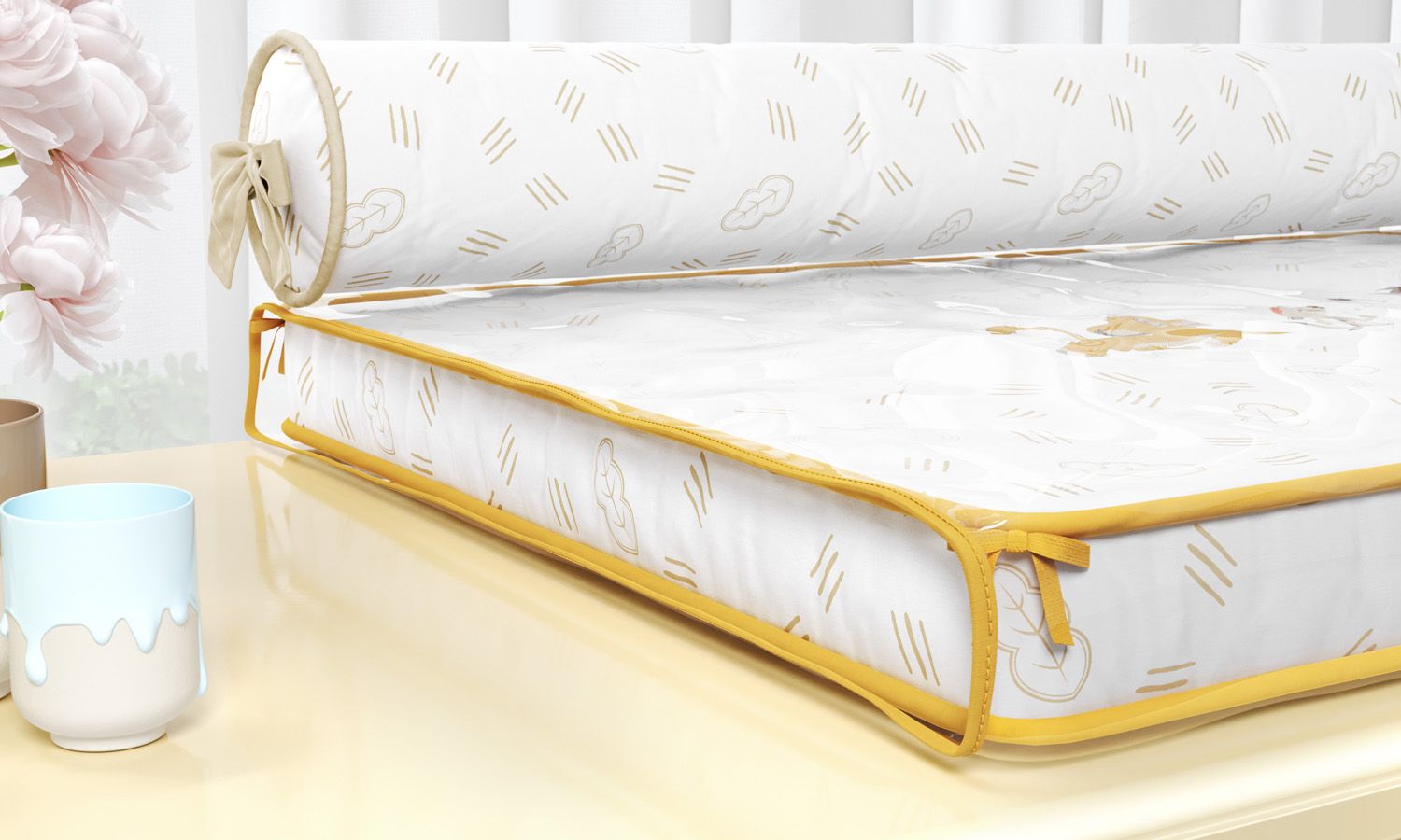 • Capa plástica impermeável com lacinhos, fácil de higienizar todo dia