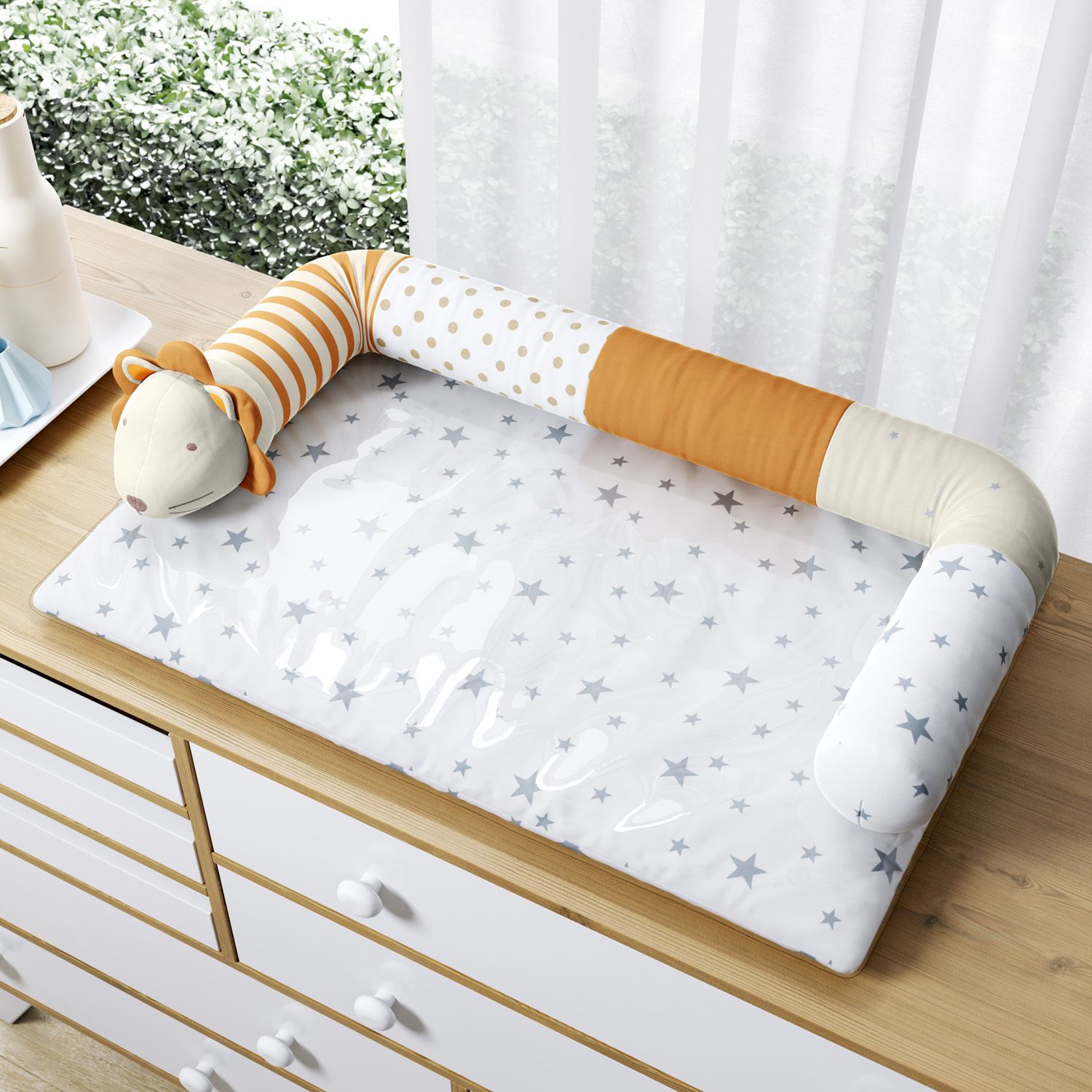 Com enchimento fofinho e capa plástica para facilitar a higienização, o trocador traz uma estampa encantadora de estrelinhas. Já o protetor rolinho Leão proporciona mais conforto e será um fiel companheiro de brincadeiras.