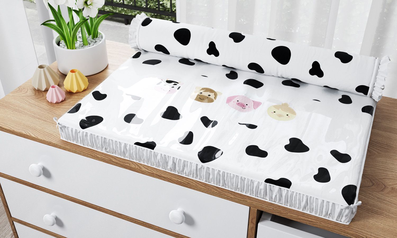 A estampa de vaquinha enfeita todo o trocador, que é confeccionado com enchimento de espuma e capa plástica que facilita a limpeza.