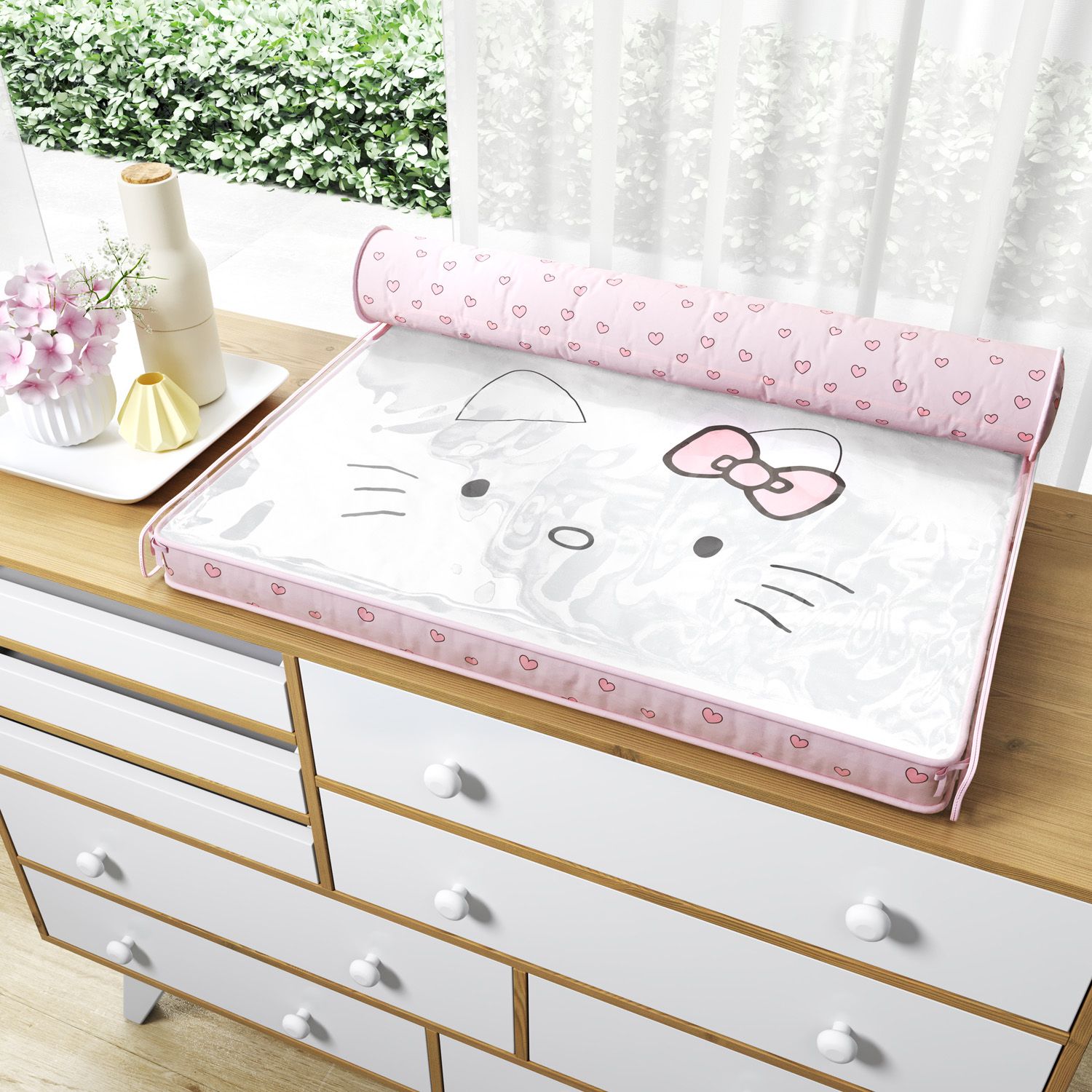 Atualizamos a definição de fofura! O Trocador de Fraldas Hello Kitty traz uma das personagens mais famosas do mundo para compor a decoração do quarto de bebê e completar o espaço de troca de fraldas. Prático e original, nosso acessório agrega conforto com sua estrutura de espuma, capa de tecido com zíper e capa plástica translúcida com viés rosa.