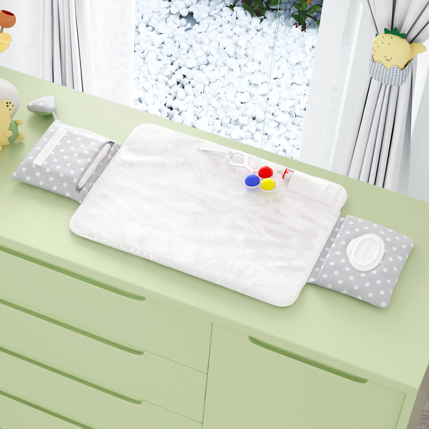 Com revestimento de plástico transparente, o acessório é fácil de limpar e acompanha um prendedor que os papais podem colocar um brinquedinho para entreter o neném durante a troca de fraldas.