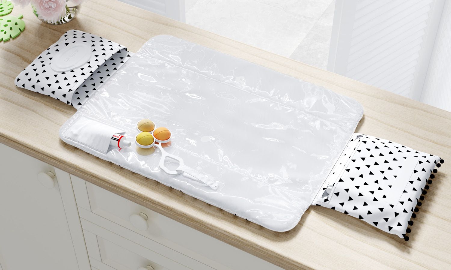 Indispensável para diversas situações, como viagens, passeios e eventos, nosso trocador tem o tamanho ideal para levar na bolsa ou mala maternidade. Higiênica e funcional, a peça tem a parte interna plastificada. Além disso, ainda traz um mix de estampas moderninhas e pompons.
