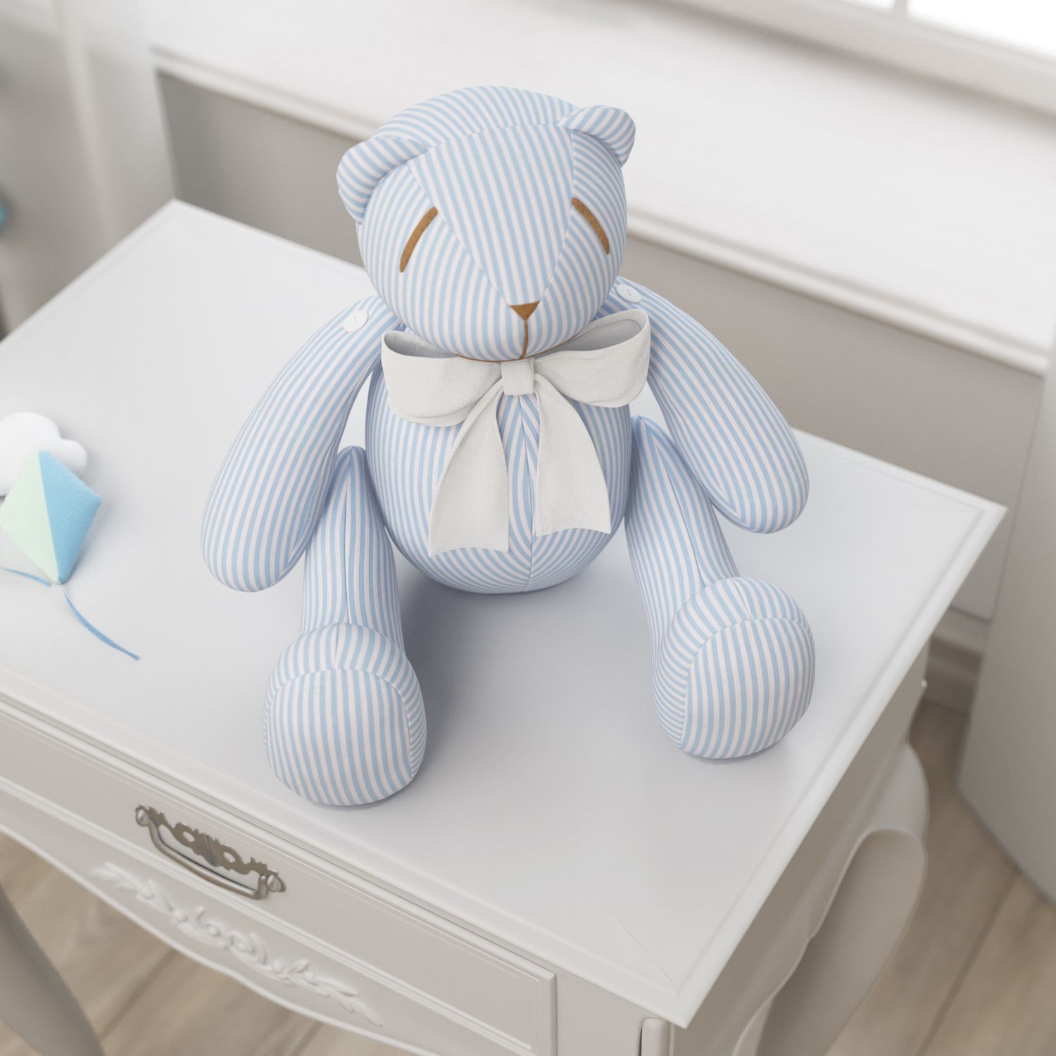 Para dar o toque final na decoração do quarto de bebê com bom gosto e suavidade, aposte no Urso Azul Listrado com Laço Branco 34cm confeccionado com estampa listrada azul e detalhes bordados. Você pode adquirir os ursinhos separadamente ou optar pelo conjunto completo. Este mimo especial vai alegrar o ambiente com delicadeza!