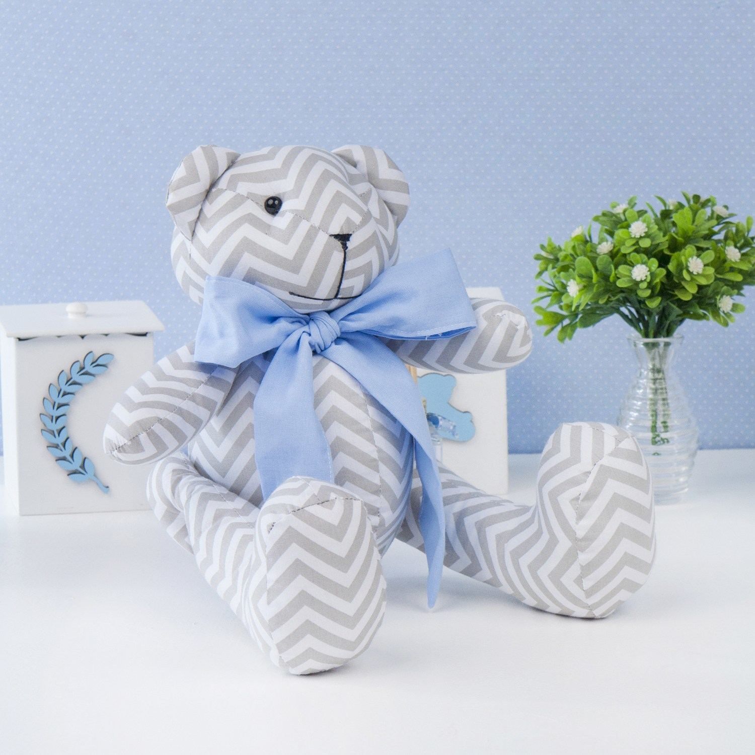 Um quarto de bebê sem um ursinho não está plenamente decorado! Nosso Urso Estampa Chevron com Laço Azul 34cm dá um toque afetivo para o enxoval e torna a atmosfera do ambiente mais lúdica! Com a suavidade da malha 100% algodão, a icônica estampa zigue-zague traz uma proposta atemporal para encantar o ambiente mais especial da casa. Além de estimular a criatividade das crianças, esse ursinho de pelúcia completa lindamente a decoração do quarto dos sonhos!