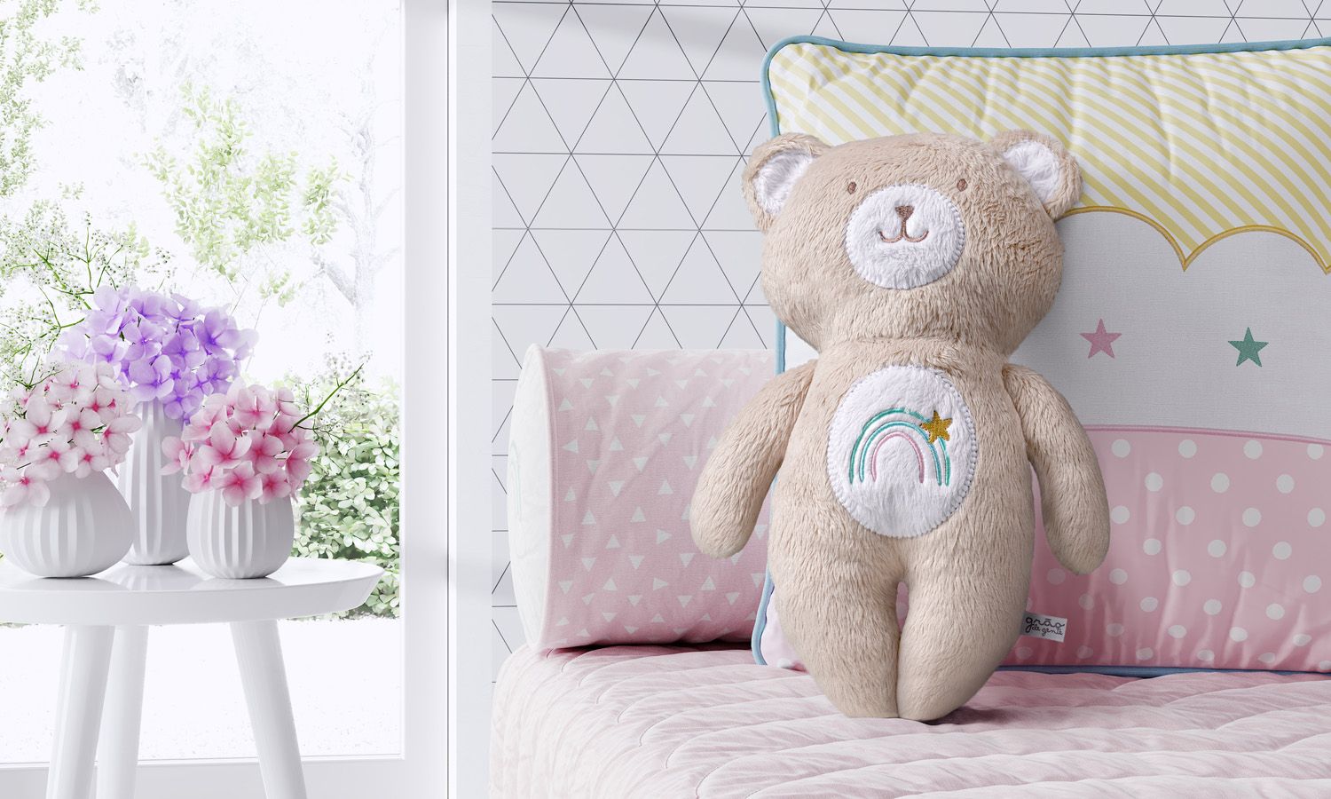 O Urso Naninha Arco-íris 30cm transborda carinho e fofura na decoração do quarto de bebê. Esse ursinho de Plush Ultra Soft bege traz um arco-íris bordado em sua barriguinha e é perfeito para abraçar de montão. Novidade da Coleção Arco-íris Patchwork, da Linha Sabrina Sato Mom.