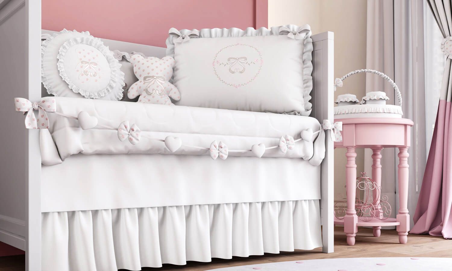 O Varal de Berço Corações e Lacinhos 1,30m é uma tendência graciosa para a decoração do quarto de bebê. Ele tem quatro enfeites de coração e três lacinhos de tecido estampado floridinho. Um mix cheio de romantismo e fofura! Para fixar o varalzinho, é só amarrar os laços laterais nas grades do berço.