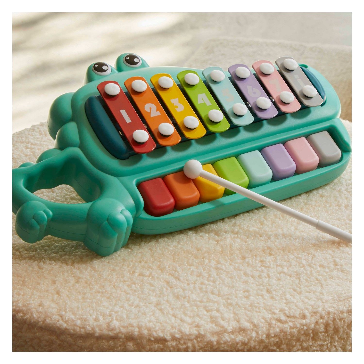 São duas opções de brincadeira: os pequenos podem usá-lo como mini piano ou como xilofone.