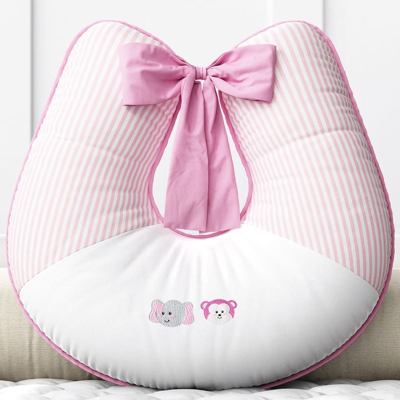 Com o enchimento confortável e o tecido 100% algodão macio proporcionam um toque suave com a pele sensível do bebê. O lacinho bege, tecido listrado e os bordados dos amiguinhos elefantinho e macaquinho garantem mais graciosidade para esse acessório tão funcional.