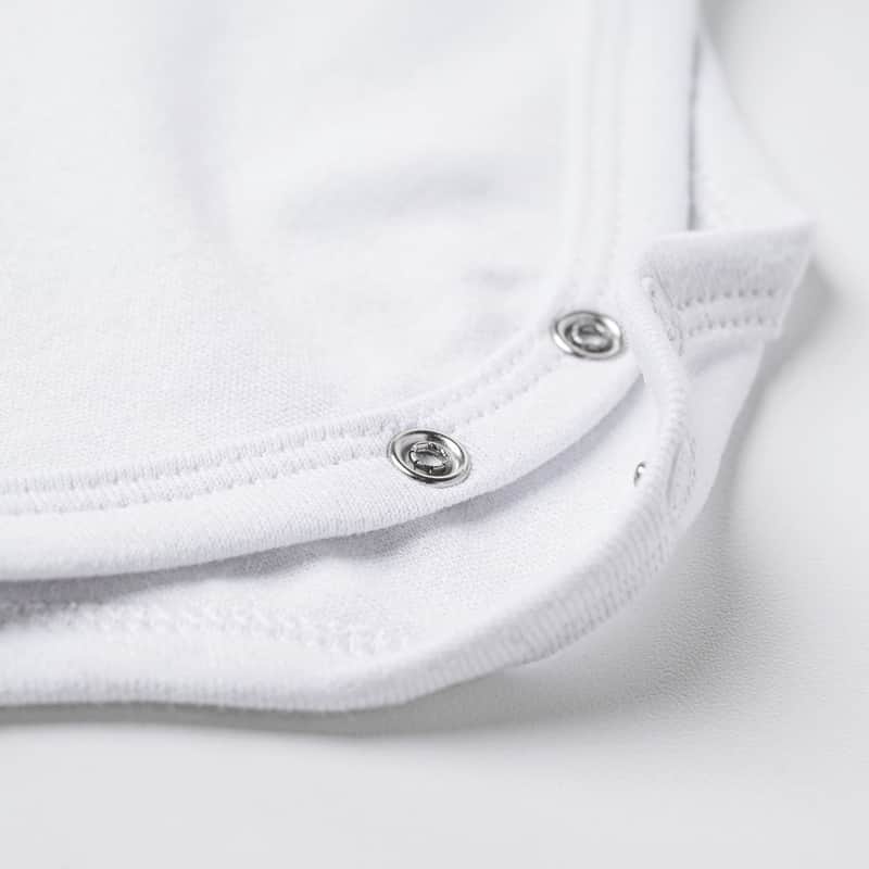 Para facilitar sua rotina, escolhemos a gola transpassada, que permite que o body seja vestido e retirado por baixo, sem passar pela cabeça do bebê. Além disso, dois botões de pressão entre as perninhas facilitam a troca de fraldas.