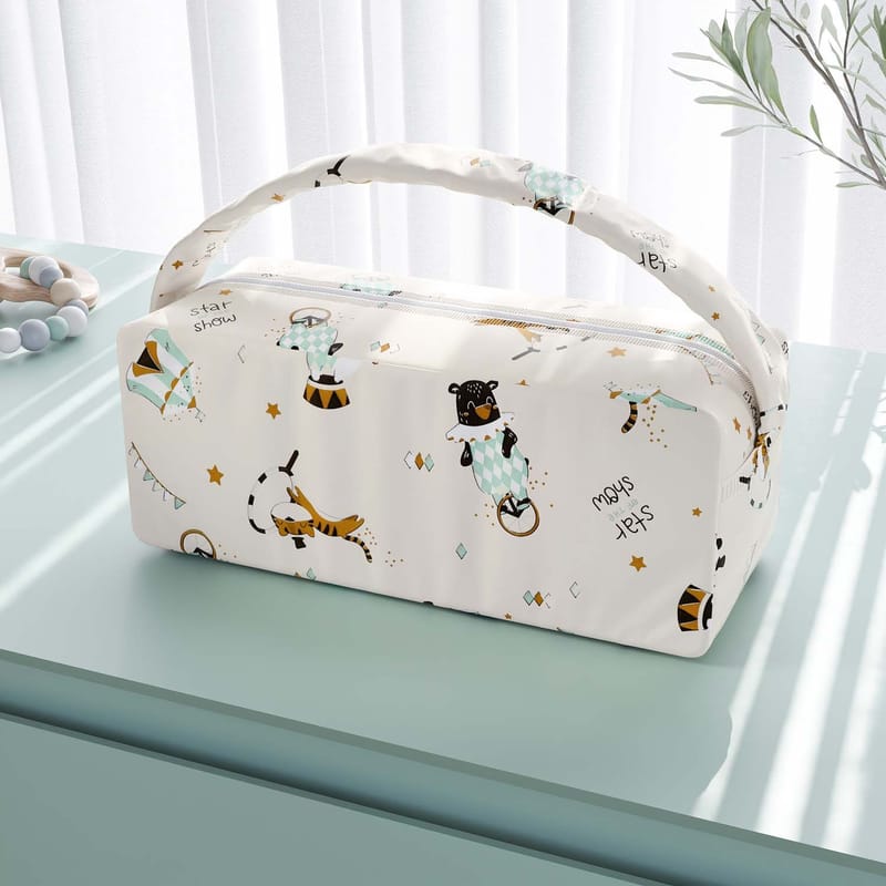 O acessório possui alça de mão e abertura por zíper, além de uma linda estampa para combinar com o tema do enxoval.