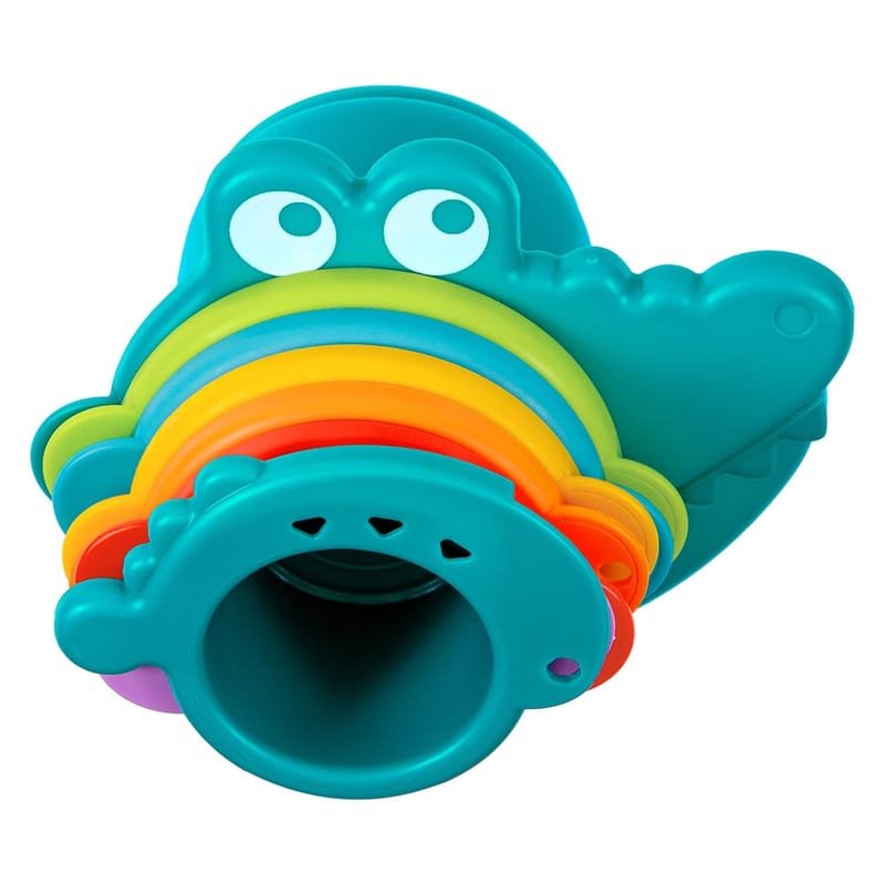 Além de serem usadas como mini chuveirinhos, a criança pode brincar de encaixar e empilhar os copinhos. Quando conectados, se transformam em um divertido jacaré.