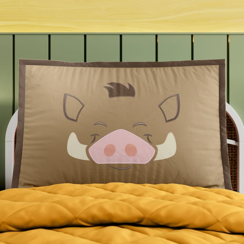 A Fronha de Travesseiro Infantil Pumba O Rei Leão Bordado é uma criação exclusiva da Grão de Gente para completar a decoração do quarto infantil com conforto e muita originalidade.