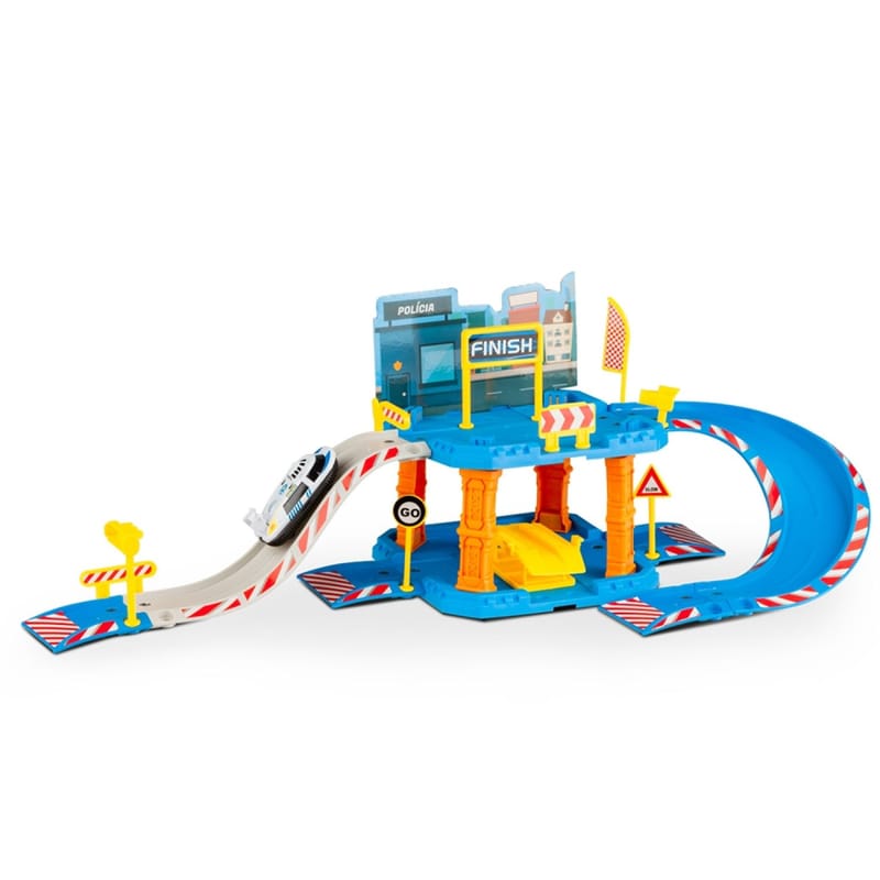Com um carrinho e 40 peças para montar sua pista de corrida, o brinquedo oferece diversas opções de garagens para montar, acompanha também um helicóptero e um boneco policial. Para brincar, basta posicionar o carrinho na base de lançamento, e ele irá fazer o percurso com muita velocidade, trazendo muita emoção e diversão para a criançada.