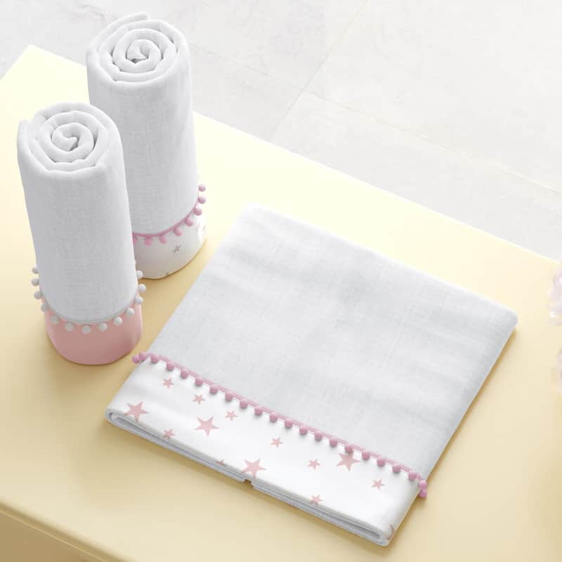 Jogo de Fraldas de Ombro Barra Estrelinhas Rosa com Pompom da Grão de Gente: R$ 86,69 no PIX ou R$ 101,99 em ate 12x sem juros. Frete gratis acima de R$499. Entrega rastreada com garantia de 7 dias para trocas.