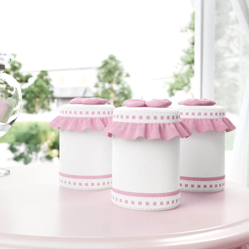 O Jogo de Potes da Coleção Alice Rosa será o maior ajudante das mamães na hora da troca de fraldas. Esse modelo com design exclusivo é composto por três lindos potes plásticos, revestidos com tecido branco e detalhes cor-de-rosa. O acessório serve para guardar produtos básicos para a higiene do bebê, como algodão, gaze e cotonete. Os babadinhos ao redor da peça acompanham um delicado laço na tampa, que adiciona charme ao cantinho da sua pequena. Aproveite para conferir o Kit Higiene completo da Coleção Alice Rosa.