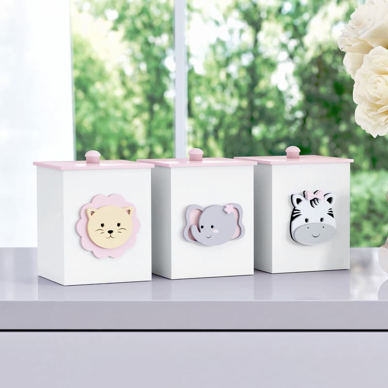 Toda mamãe e papai sabe da importância de ter um quarto de bebê funcional e preparado para receber o seu maior amor. Por isso, o Jogo de Potes Amiguinhos Safári é muito importante para que o cantinho se torne tudo aquilo que você sempre sonhou. Seu design charmoso conta aplicação em madeira dos amiguinhos leão, elefante e zebra. A funcionalidade dos potes é um grande destaque, pois você pode guardar e organizar diversos objetos, como lencinhos, gazes, cotonetes, cortador de unha e muito mais. Confeccionados em plástico para garantir alta resistência, esse Jogo de Potes é ideal para que o seu dia a dia fique mais prático!